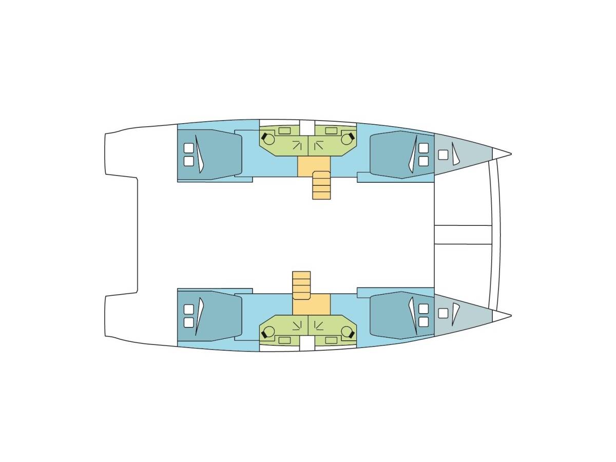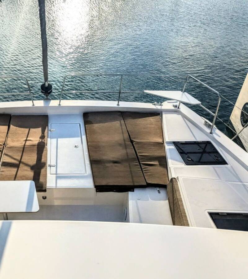 Die Bali 4.4 "CURRENT BREAK" ist ausgestattet mit einem Großsegel und einem Genoa sowie einer Bimini Top, Autopilot.