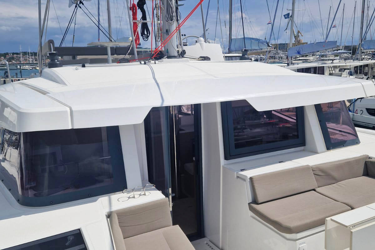 Die Bali 4.6 "Anjita" ist ausgestattet mit einem Großsegel und einem Genoa sowie einer Bimini Top, Autopilot, Heizung, Teak im Cockpit.