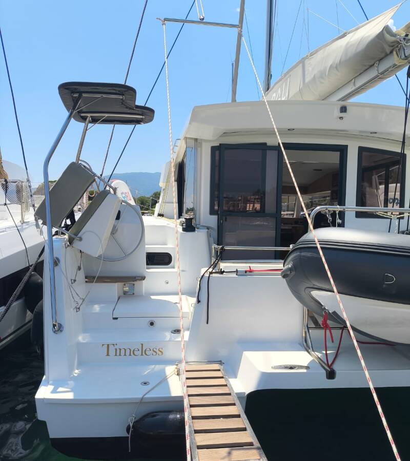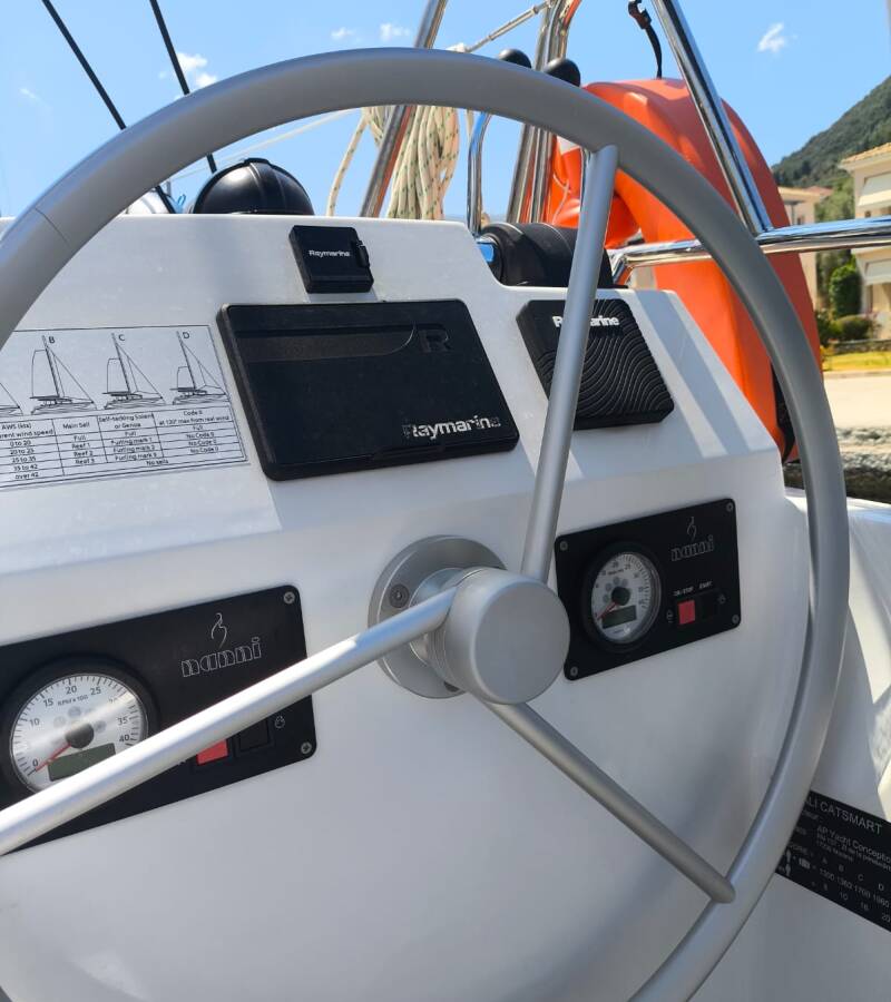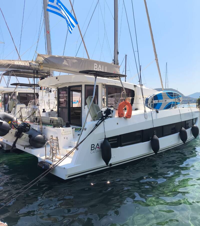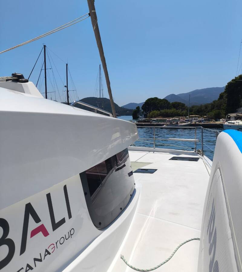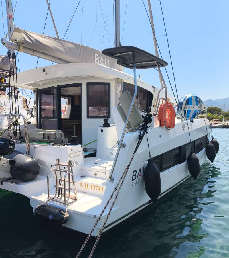 Die Bali Catsmart "Timeless" ist ausgestattet mit einem Großsegel und einem Genoa sowie einer Bimini Top, Autopilot.