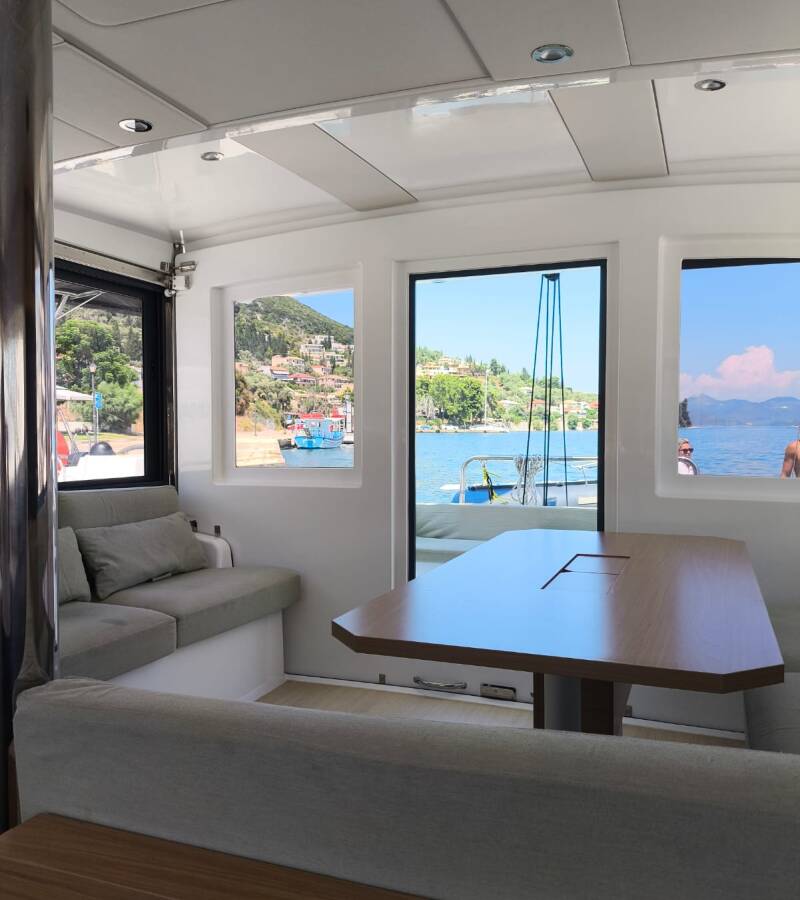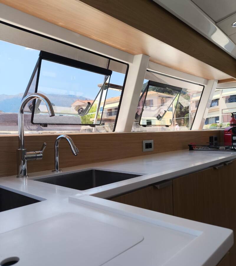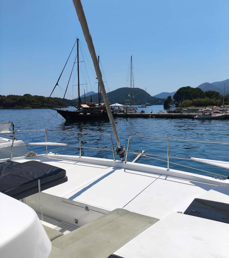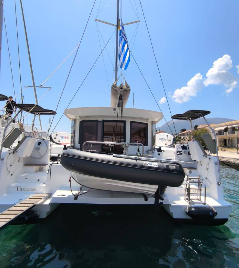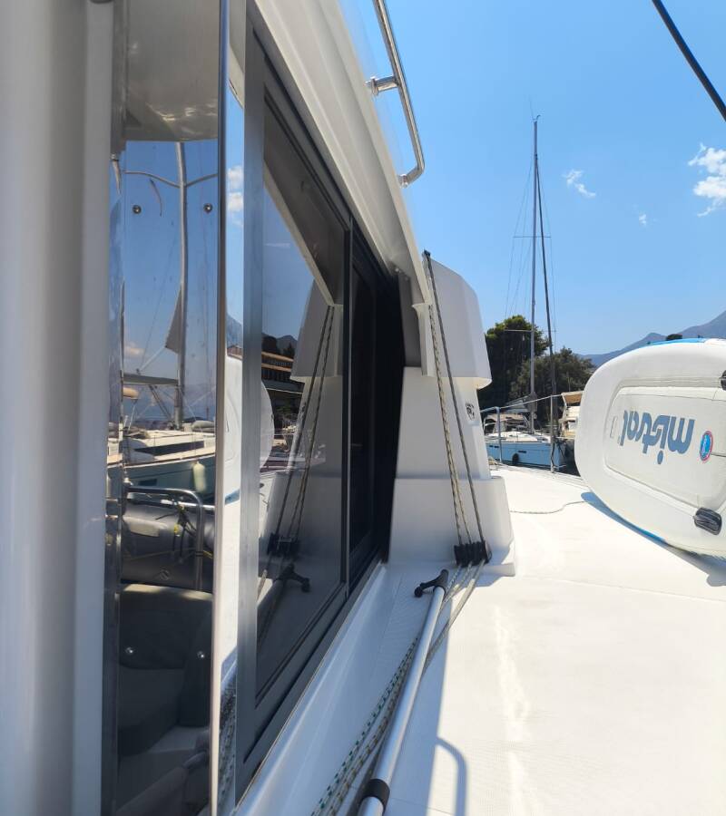 Die Bali Catsmart "Timeless" ist ausgestattet mit einem Großsegel und einem Genoa sowie einer Bimini Top, Autopilot.
