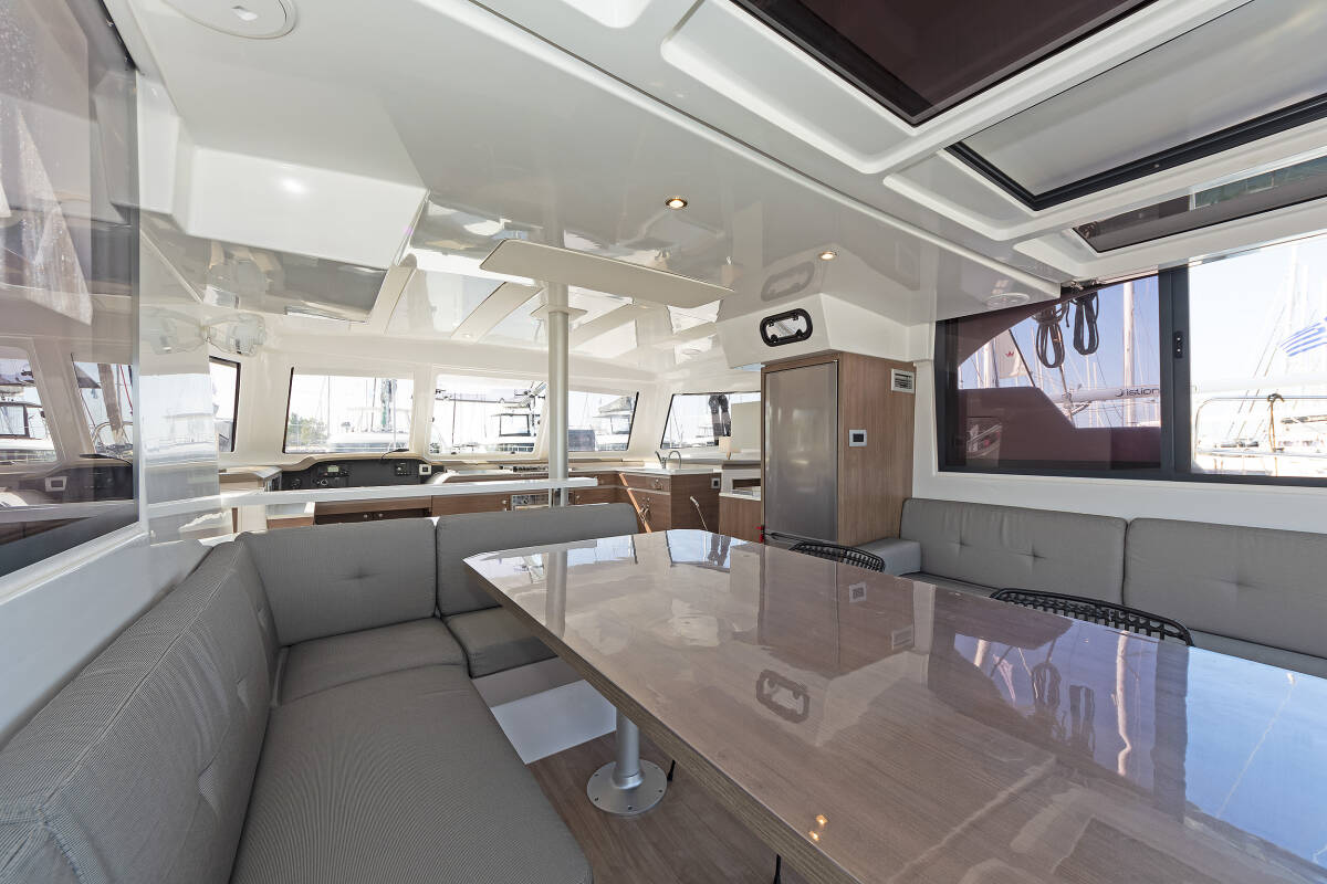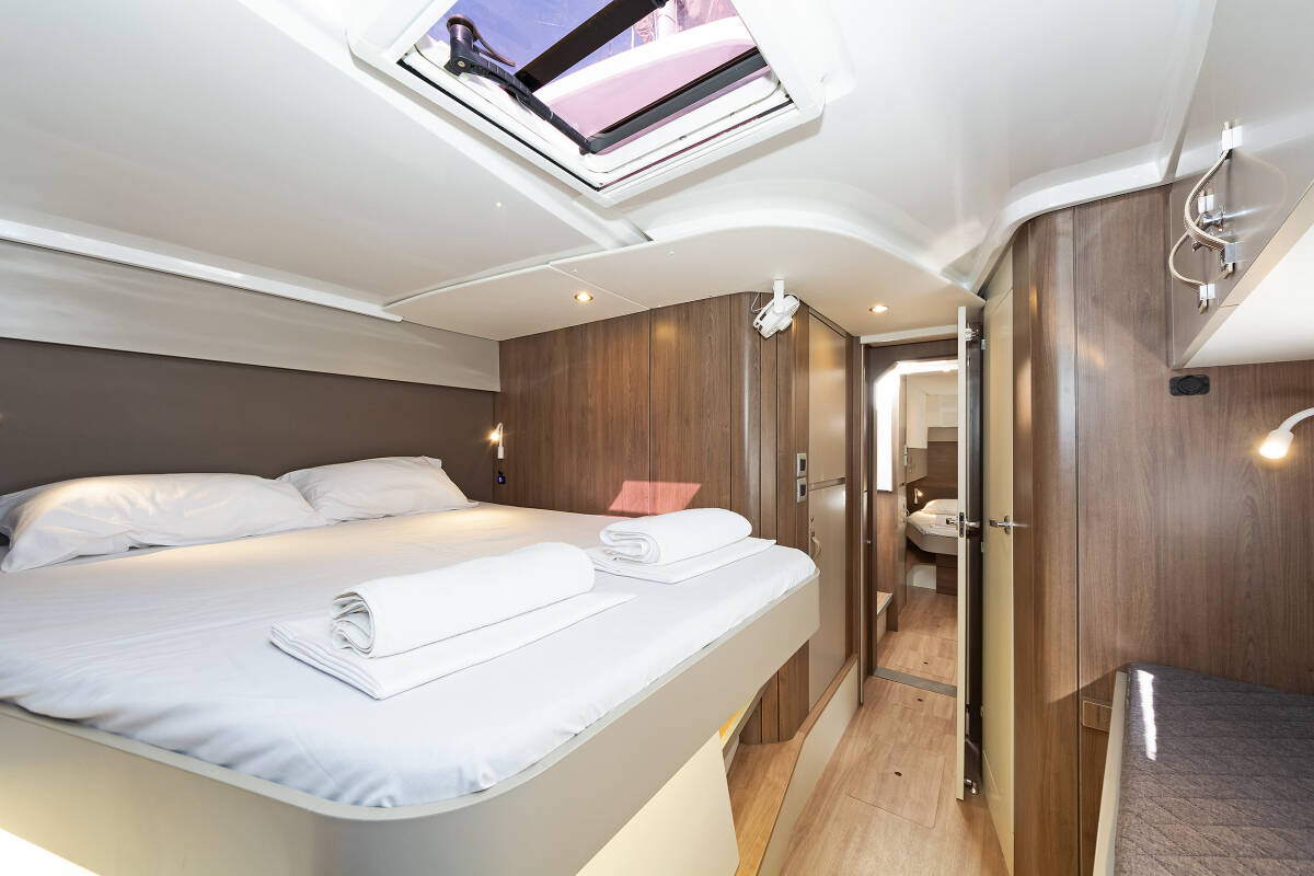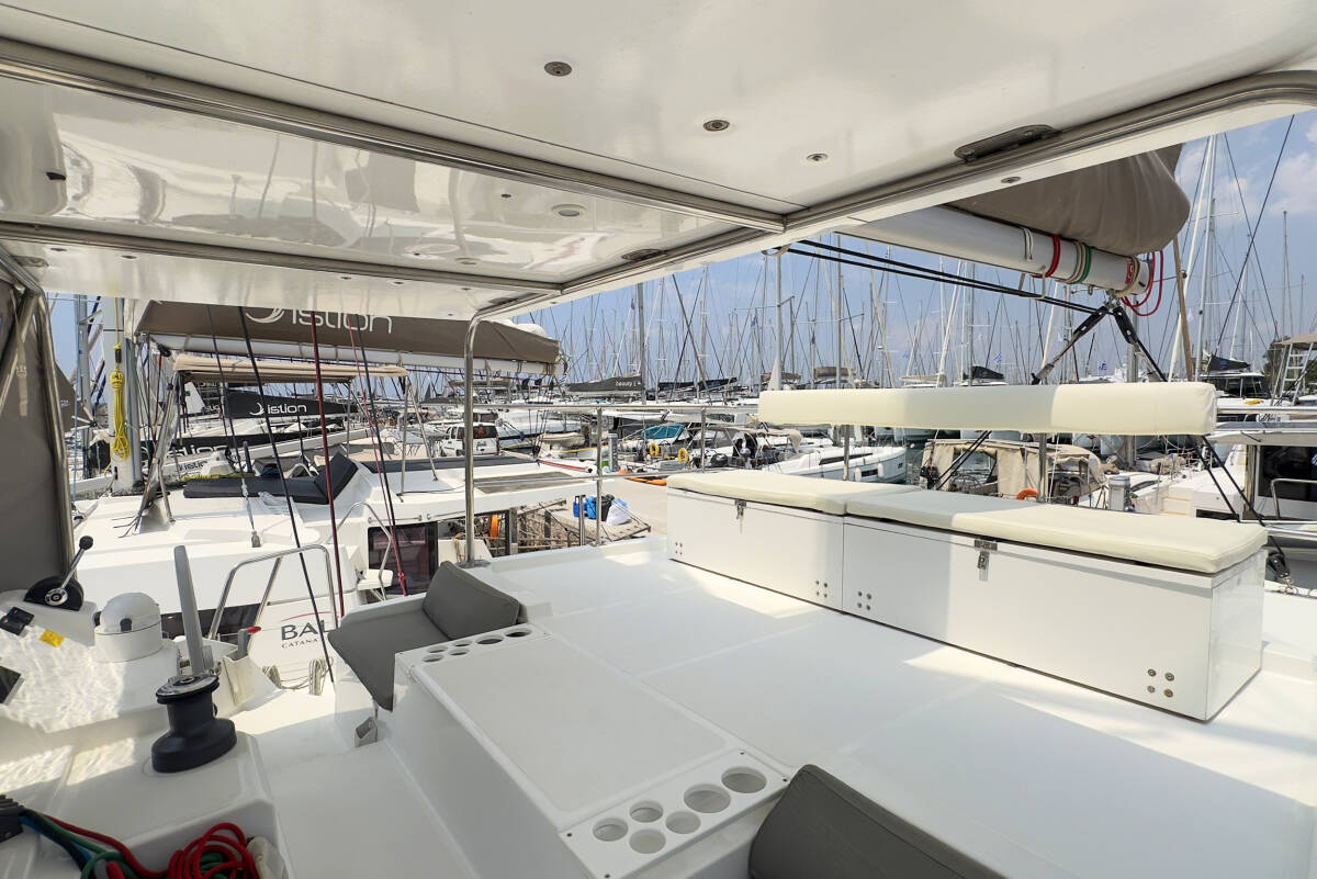 Die Bali Catspace "Princess Malena" ist ausgestattet mit einem Großsegel und einem Genoa sowie einer Bimini Top, Autopilot, Sprayhood, GPS Kartenplotter - Cockpit.