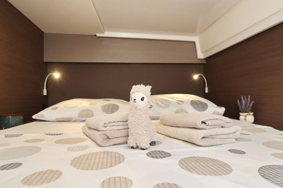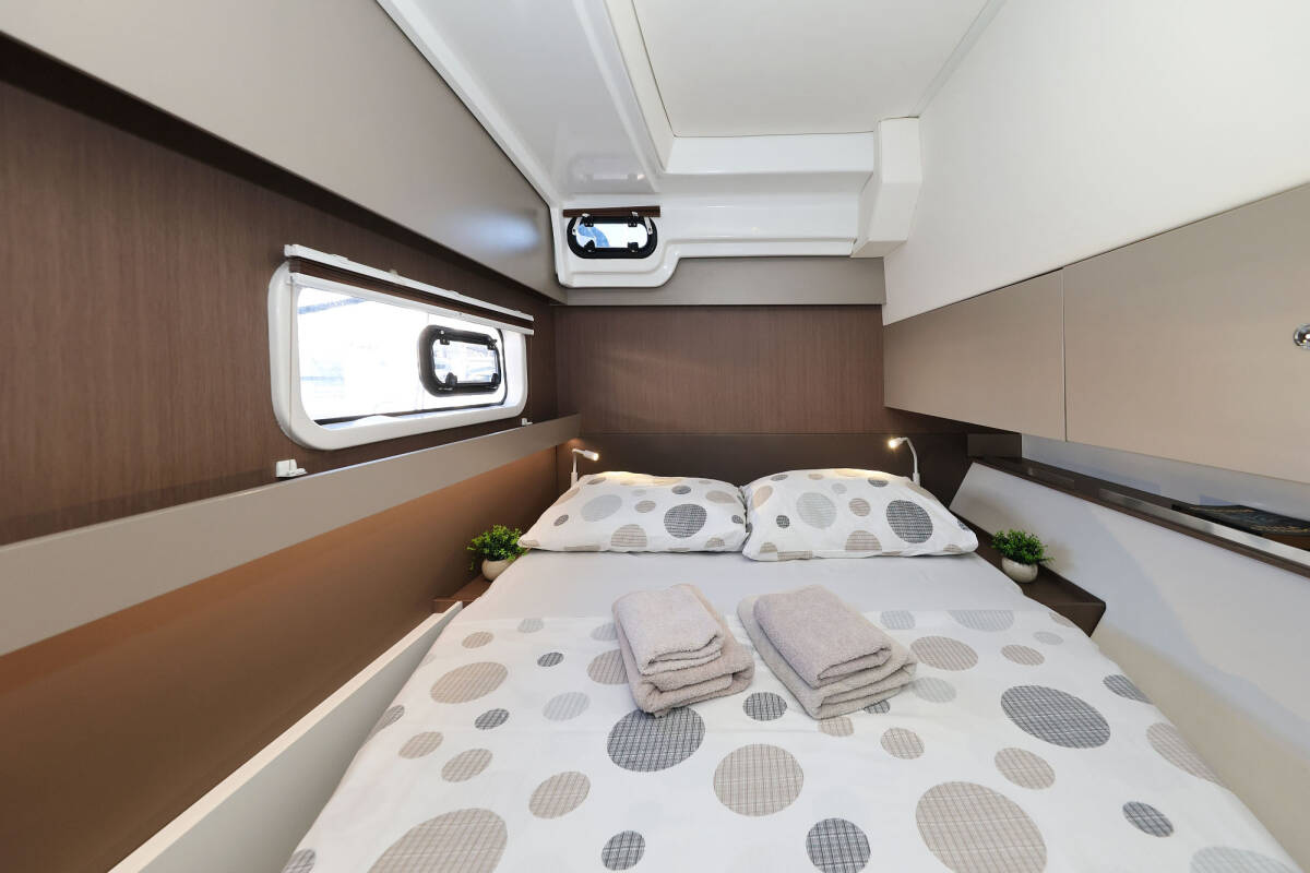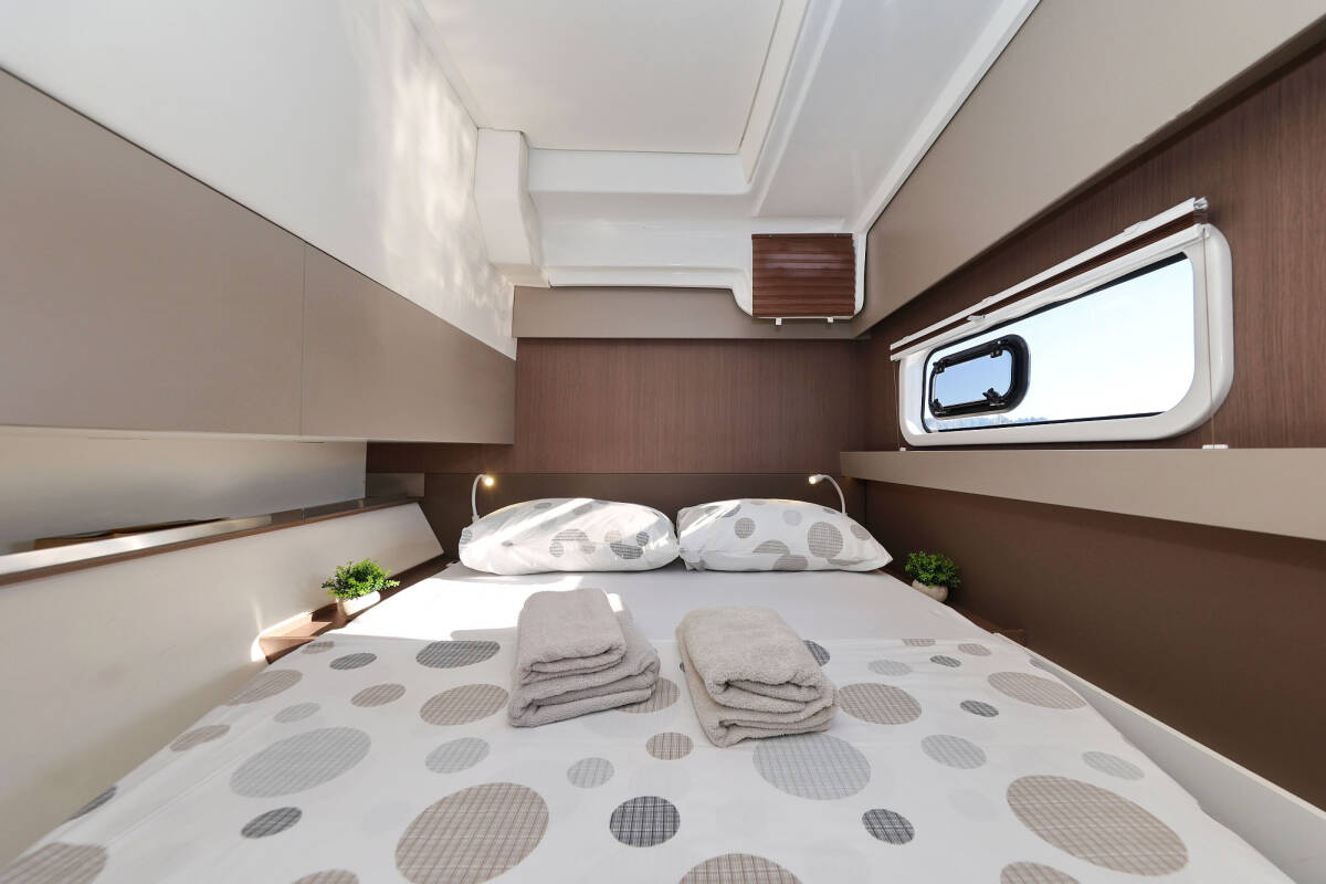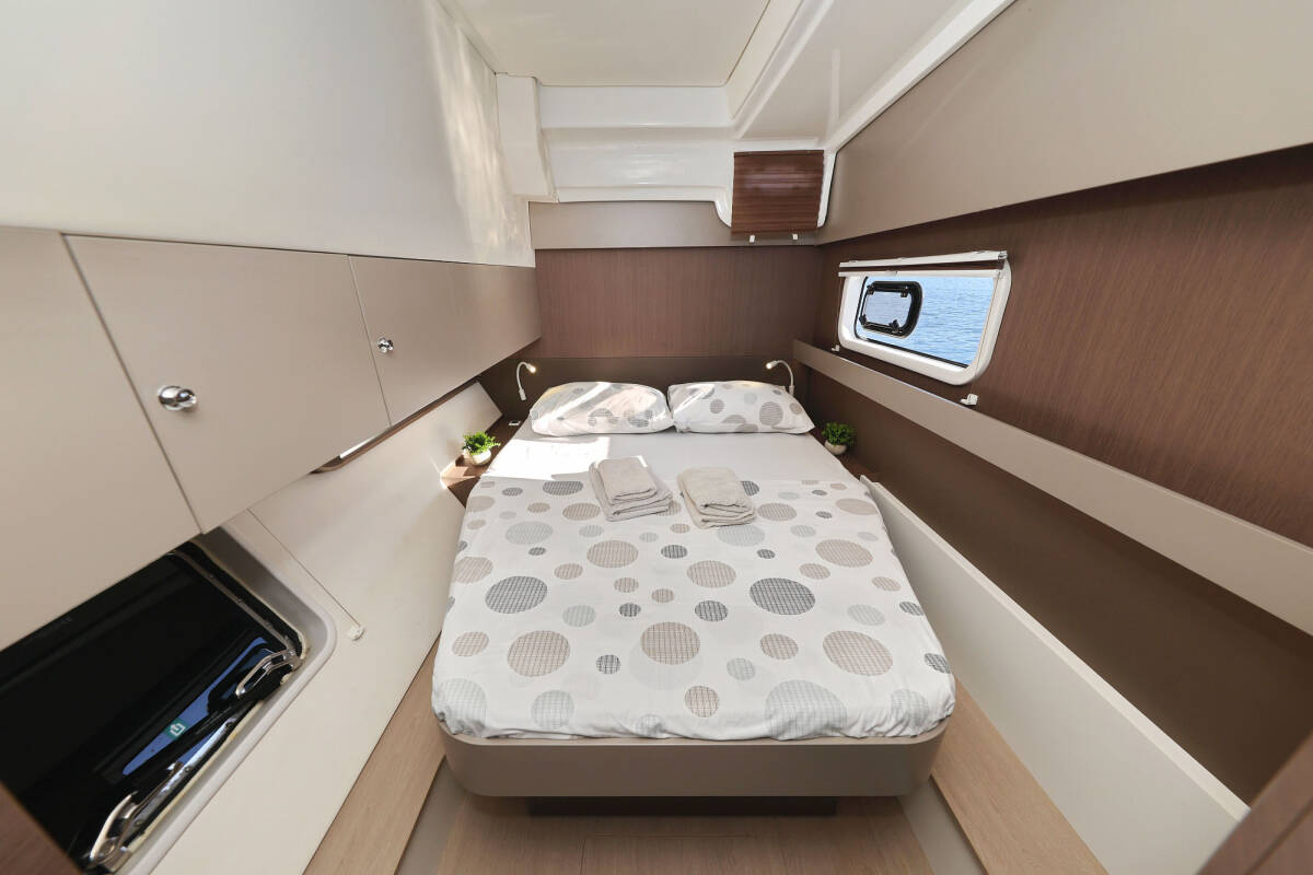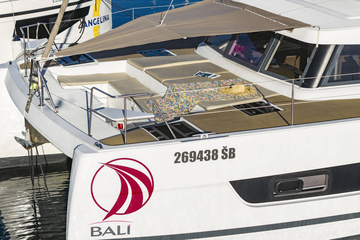 Die Bali Catspace "Viola" ist ausgestattet mit einem Großsegel und einem Genoa sowie einer Bimini Top, Autopilot.