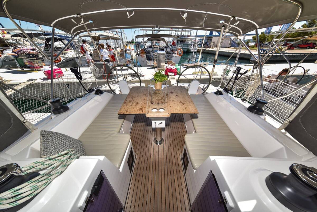 Die Bavaria C38 "Seka VI" ist ausgestattet mit einem Großsegel und einem Genoa sowie einer Bimini Top, Autopilot, Sprayhood, Teak im Cockpit, GPS Kartenplotter - Cockpit.