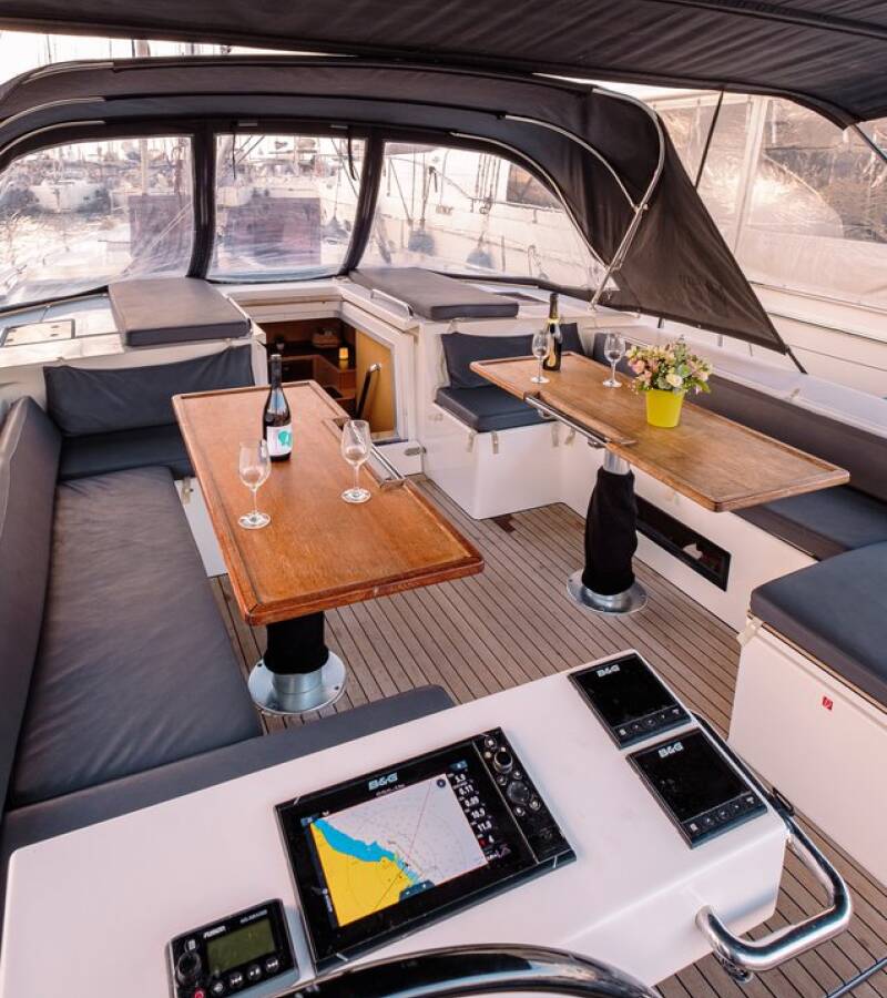 Die Bavaria C57 "Ghost" ist ausgestattet mit einem Großsegel und einem Genoa sowie einer Bimini Top, Autopilot, Sprayhood, Teak im Cockpit, GPS Kartenplotter - Cockpit.
