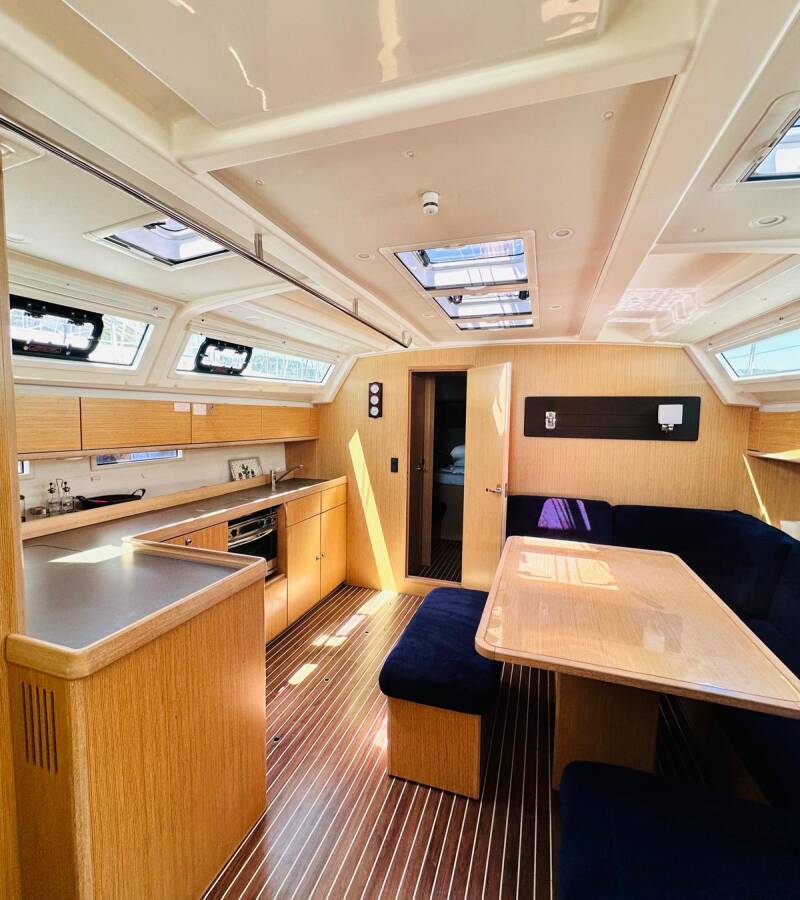 Die Bavaria Cruiser 46 "Miber Stella" ist ausgestattet mit einem Großsegel und einem Genoa sowie einer Bimini Top, Autopilot, Sprayhood, Teak im Cockpit.