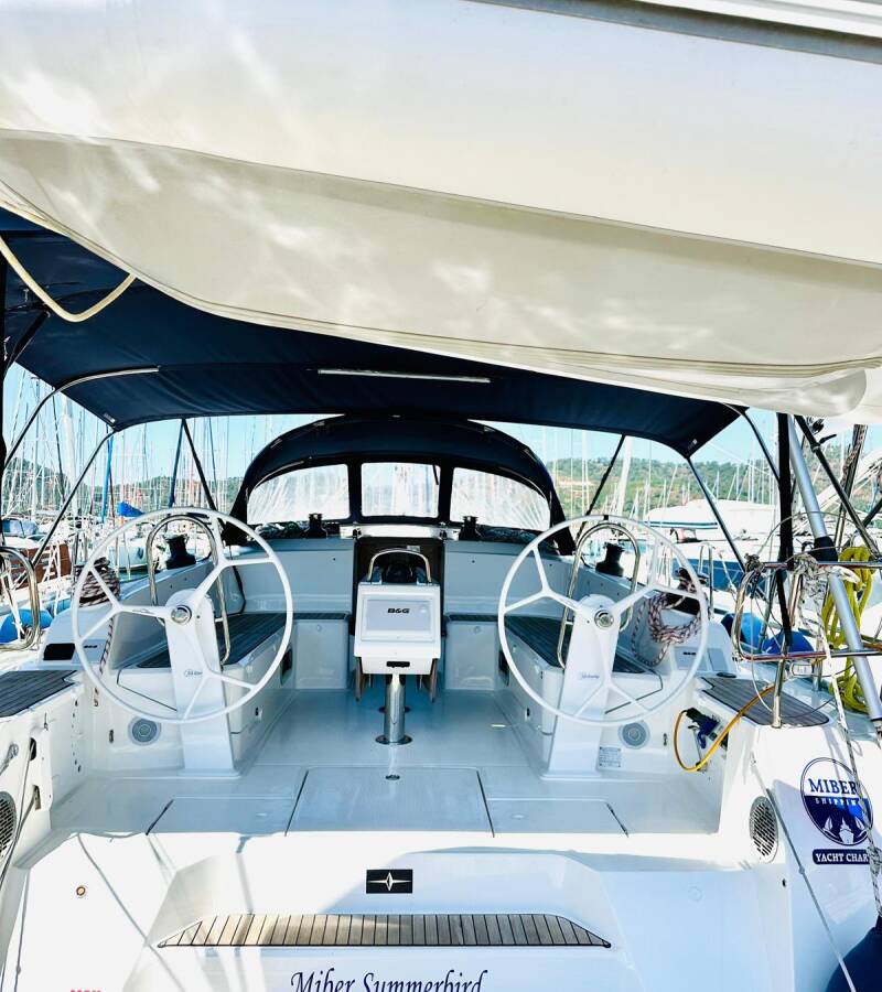 Die Bavaria Cruiser 46 "Miber Summerbird" ist ausgestattet mit einem Großsegel und einem Genoa sowie einer Bimini Top, Autopilot, Sprayhood, Heizung.
