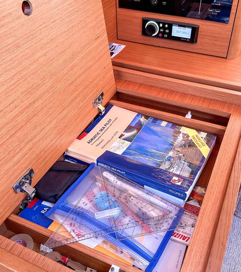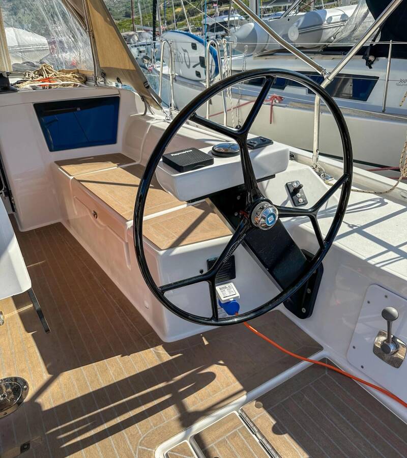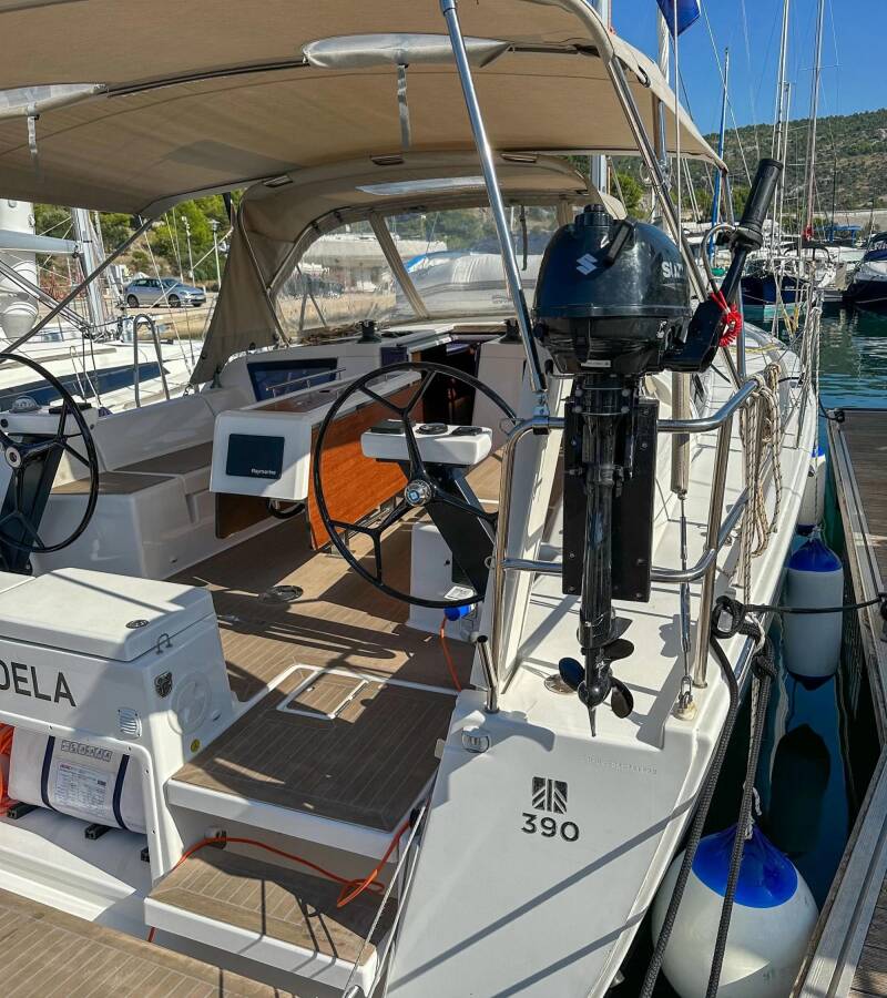 Die Dufour 390 GL "Andela" ist ausgestattet mit einem Großsegel und einem Genoa sowie einer Bimini Top, Autopilot, Sprayhood, Heizung, GPS Kartenplotter - Cockpit.
