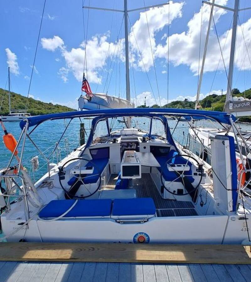 Die Dufour 430 "Sunshine Daydream" ist ausgestattet mit einem Großsegel und einem Genoa sowie einer Bimini Top, Autopilot, Sprayhood, GPS Kartenplotter - Cockpit.