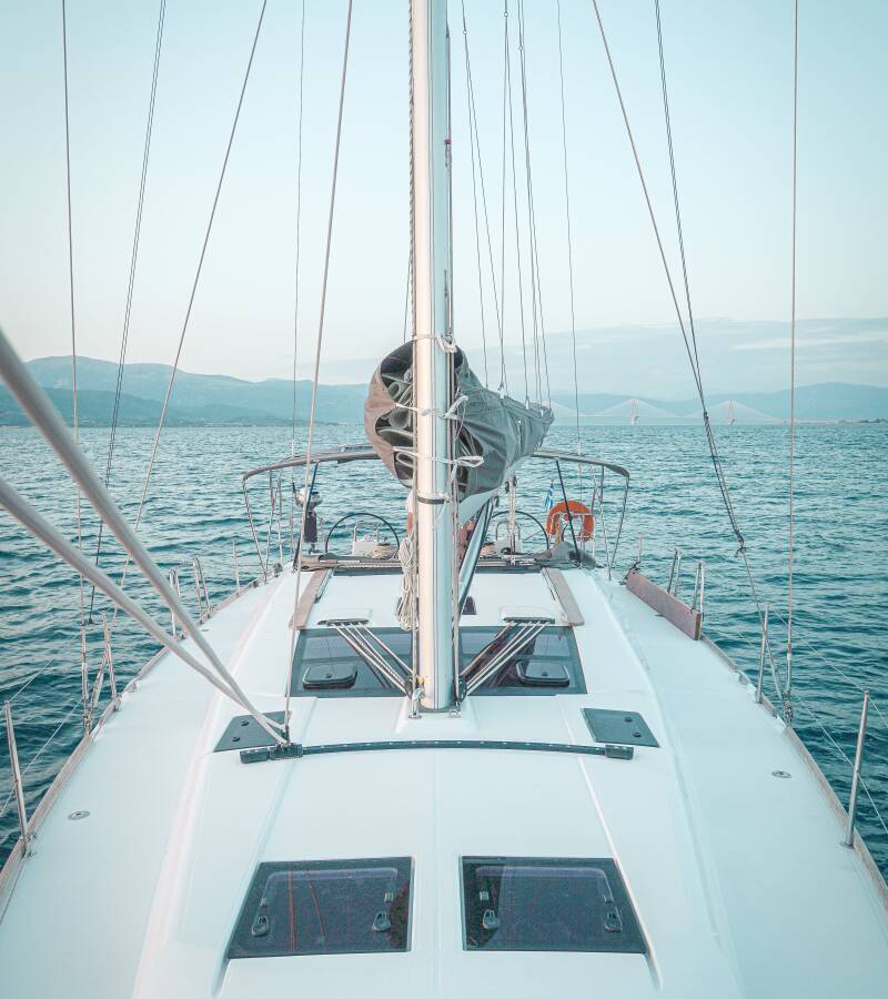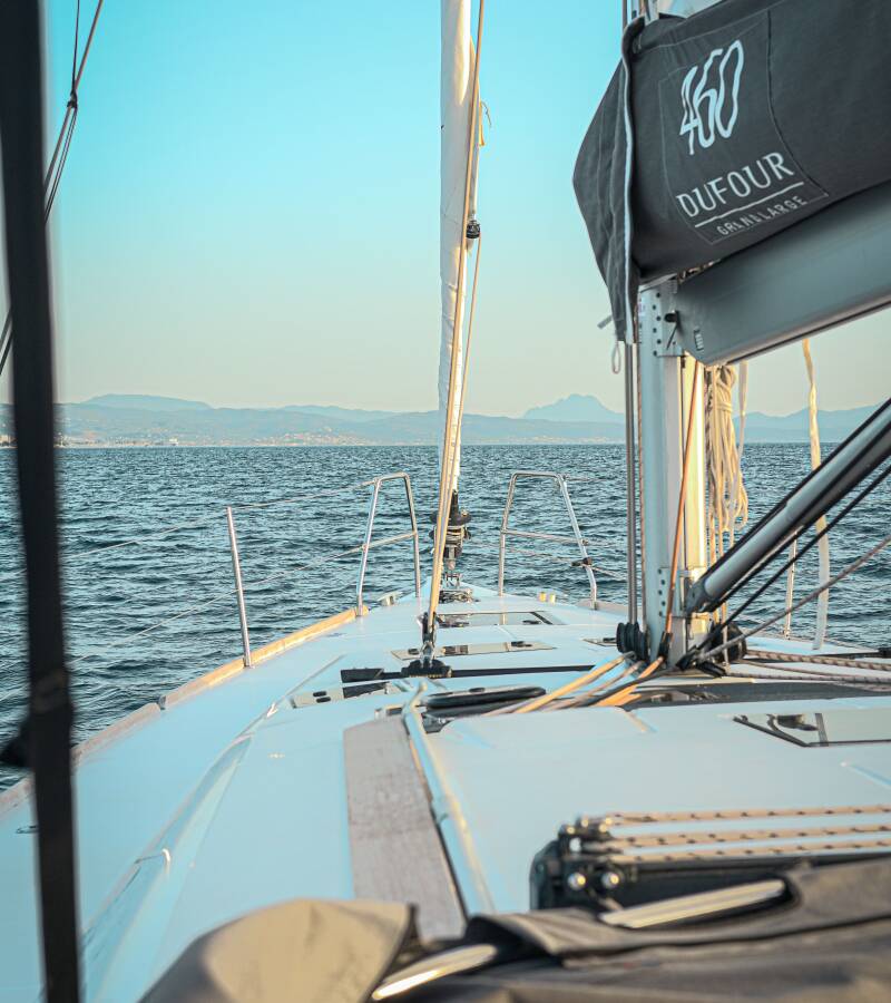 Die Dufour 460 GL "" ist ausgestattet mit einem Großsegel und einem Genoa sowie einer Teak im Cockpit.