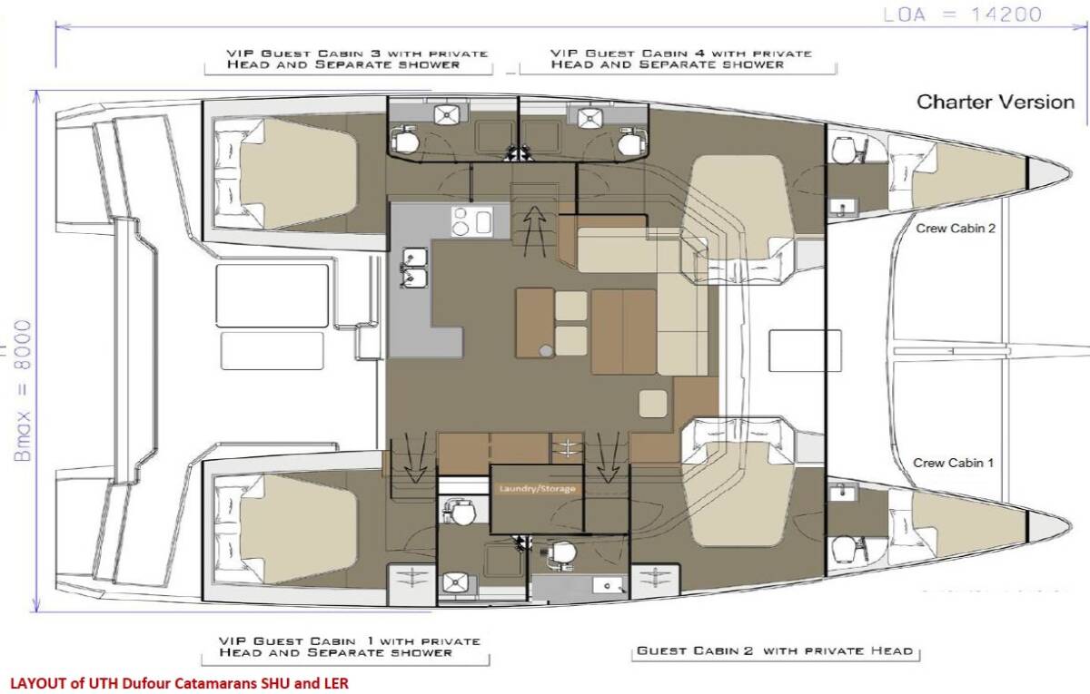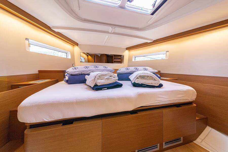 Die Dufour 48 Catamaran "Mark" bietet besonderen Komfort mit folgenden Ausstattungsmerkmalen: Generator, Klimaanlage, Tiefkühlfach, Waschmaschine, Inverter, Elektrische Toilette, Spülmaschine.