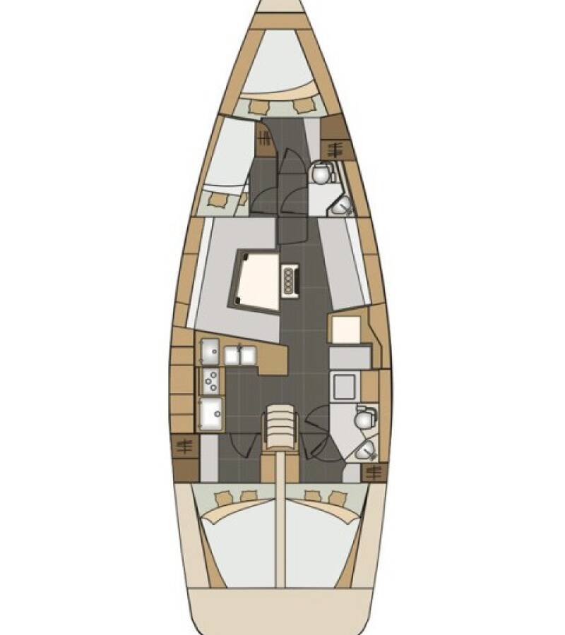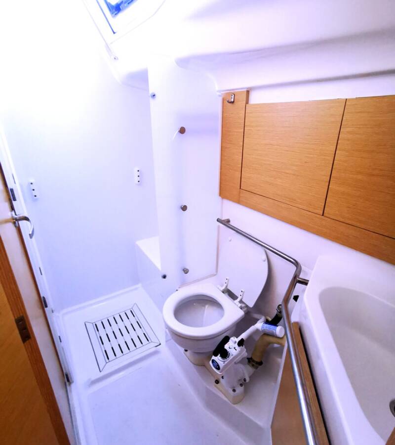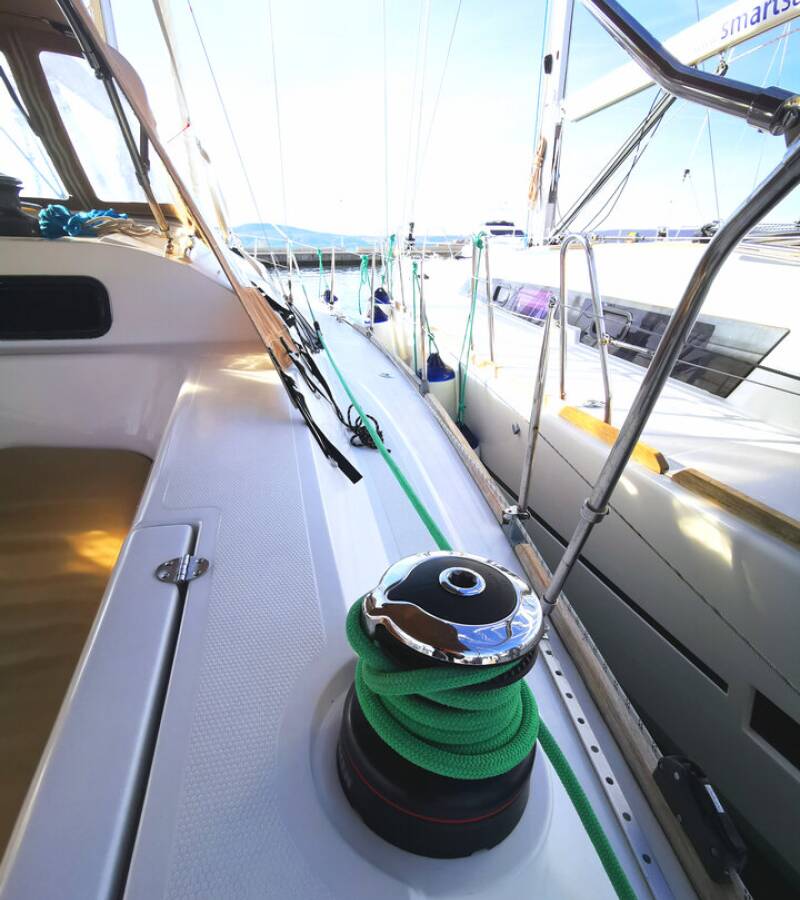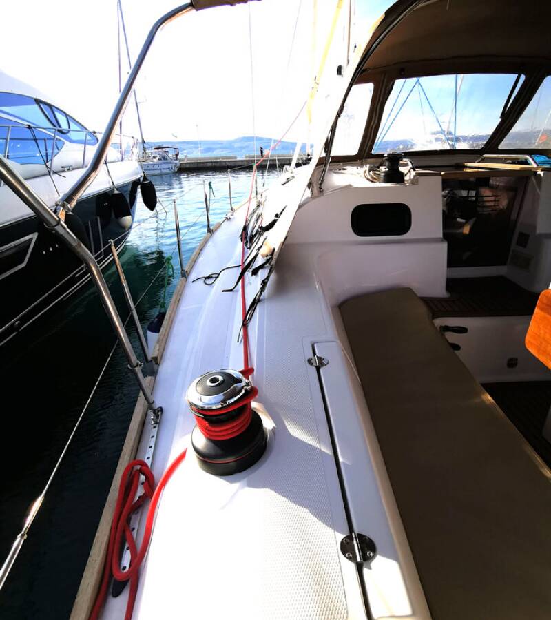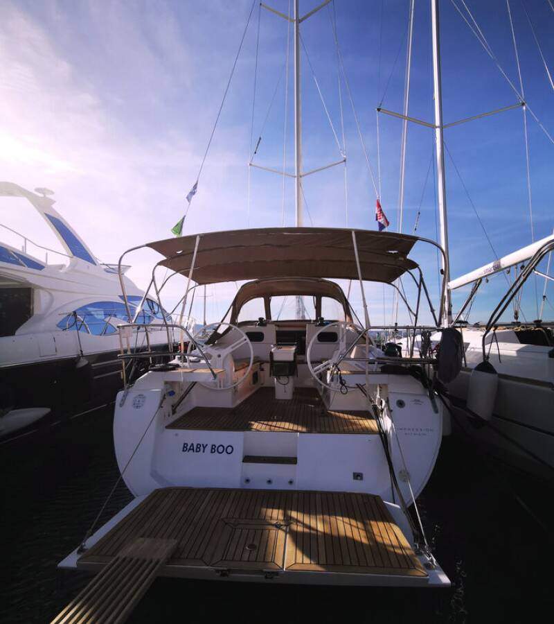 Die Elan Impression 45 "Baby Boo" ist ausgestattet mit einem Großsegel und einem Genoa sowie einer Bimini Top, Autopilot, Sprayhood, Heizung, Teak im Cockpit, GPS Kartenplotter - Cockpit.