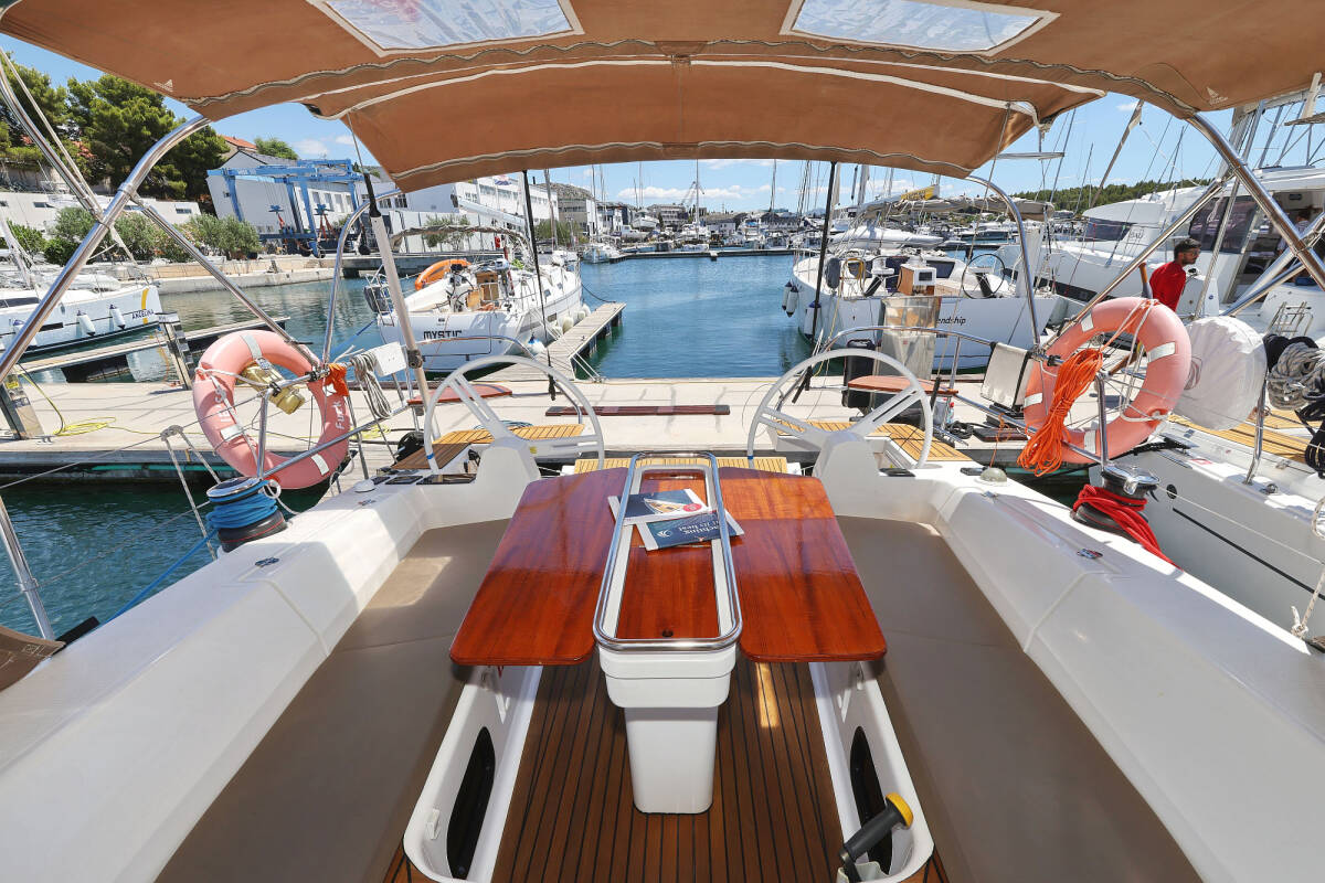 Die Elan Impression 45 "Ibiss" ist ausgestattet mit einem Großsegel und einem Genoa sowie einer Bimini Top, Autopilot, Sprayhood, Heizung, Teak im Cockpit, GPS Kartenplotter - Cockpit.