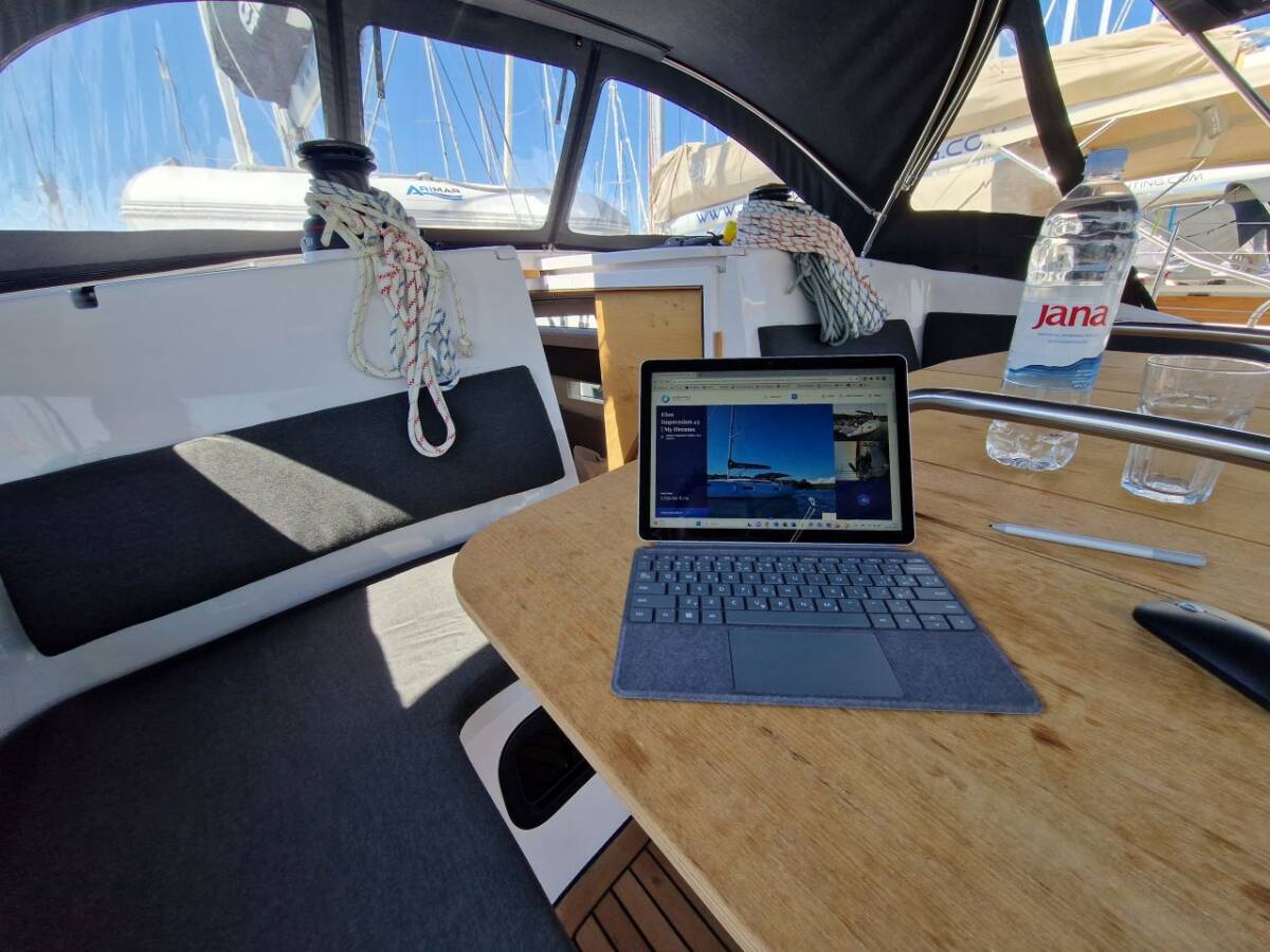 Die Elan Impression 45 "My Dreams" ist ausgestattet mit einem Großsegel und einem Genoa sowie einer Bimini Top, Autopilot, Sprayhood, Heizung, Teak im Cockpit.