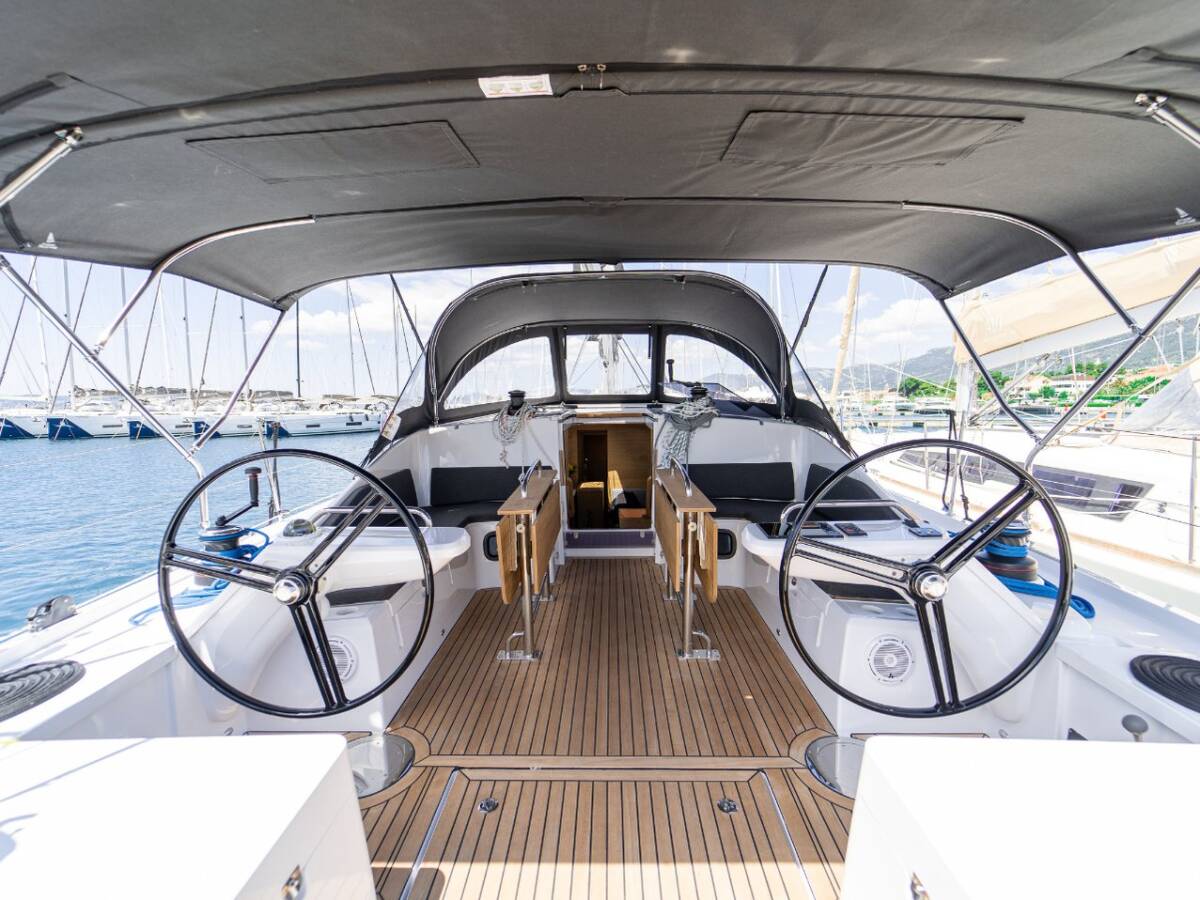 Die Elan Impression 45 "Trinity" ist ausgestattet mit einem Großsegel und einem Genoa sowie einer Bimini Top, Autopilot, Sprayhood, Teak im Cockpit.