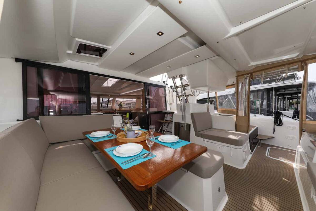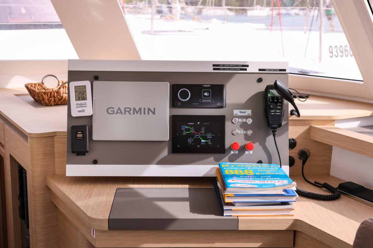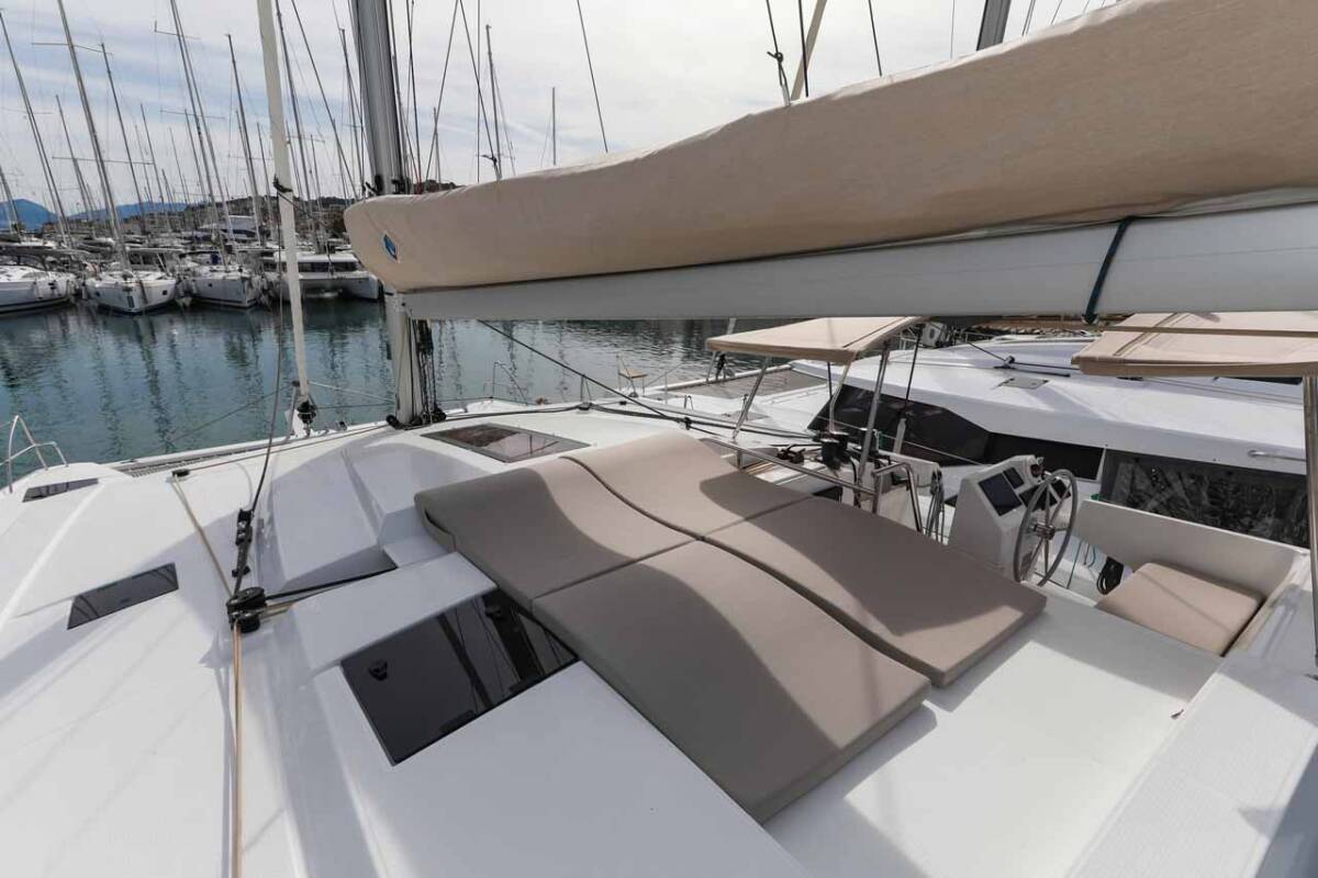 Die Fountaine Pajot Astrea 42 "Alchiba" ist ausgestattet mit einem Großsegel und einem Genoa sowie einer Bimini Top, Autopilot, Sprayhood, Heizung, Teak im Cockpit, GPS Kartenplotter - Cockpit.