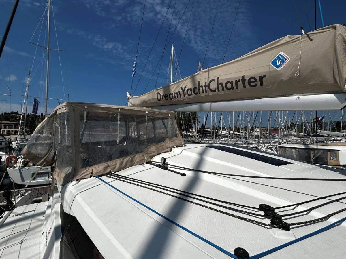 Die Fountaine Pajot Astrea 42 "HAKUNA MATATA I" ist ausgestattet mit einem Großsegel und einem Genoa sowie einer Bimini Top, Autopilot.