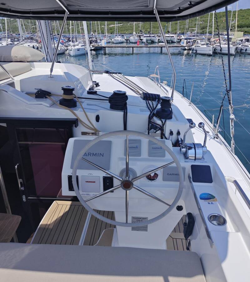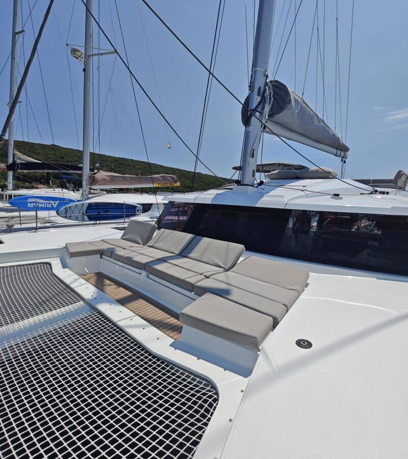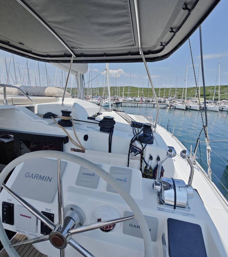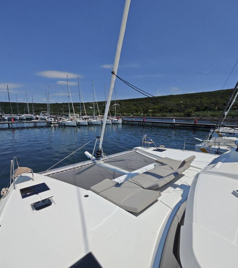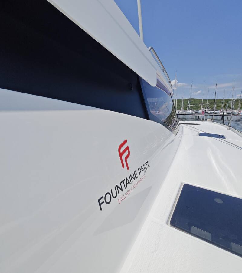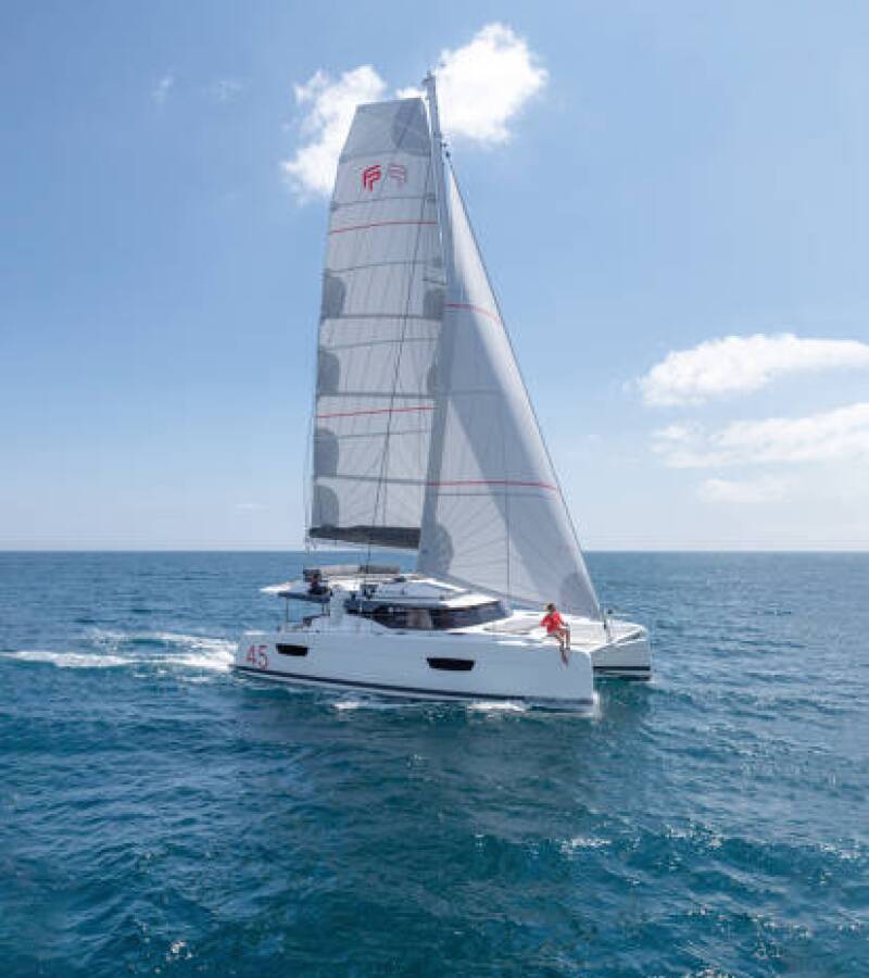 Die Fountaine Pajot Elba 45 "Caramita" ist ausgestattet mit einem Großsegel und einem Genoa sowie einer Bimini Top.
