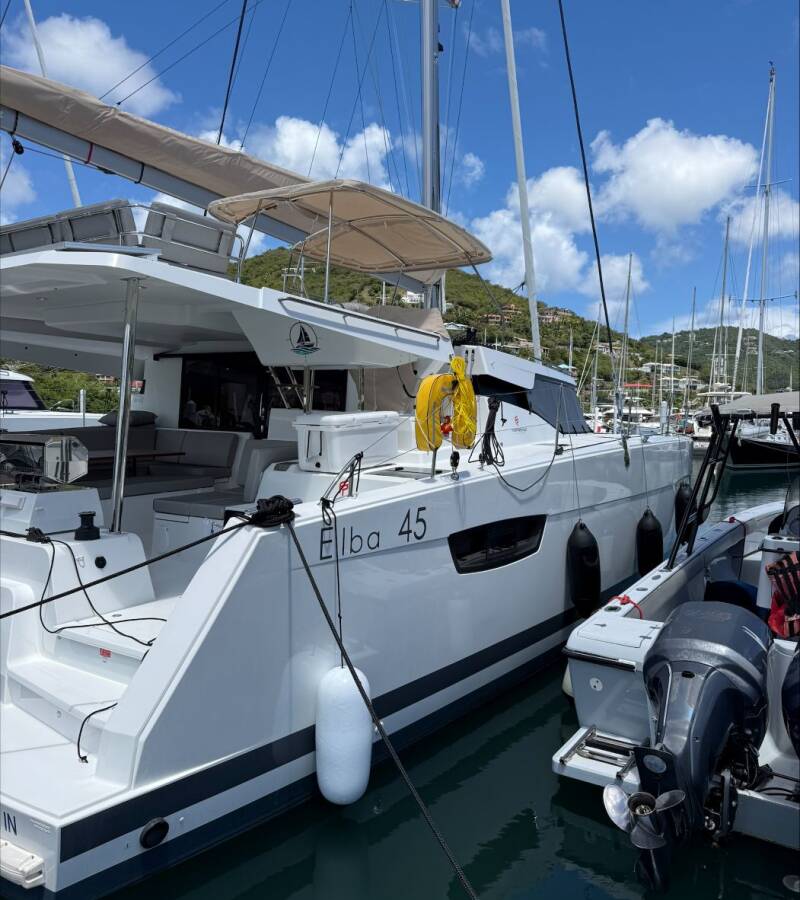 Die Fountaine Pajot Elba 45 "" ist ausgestattet mit einem Großsegel und einem Genoa sowie einer Bimini Top, Autopilot.