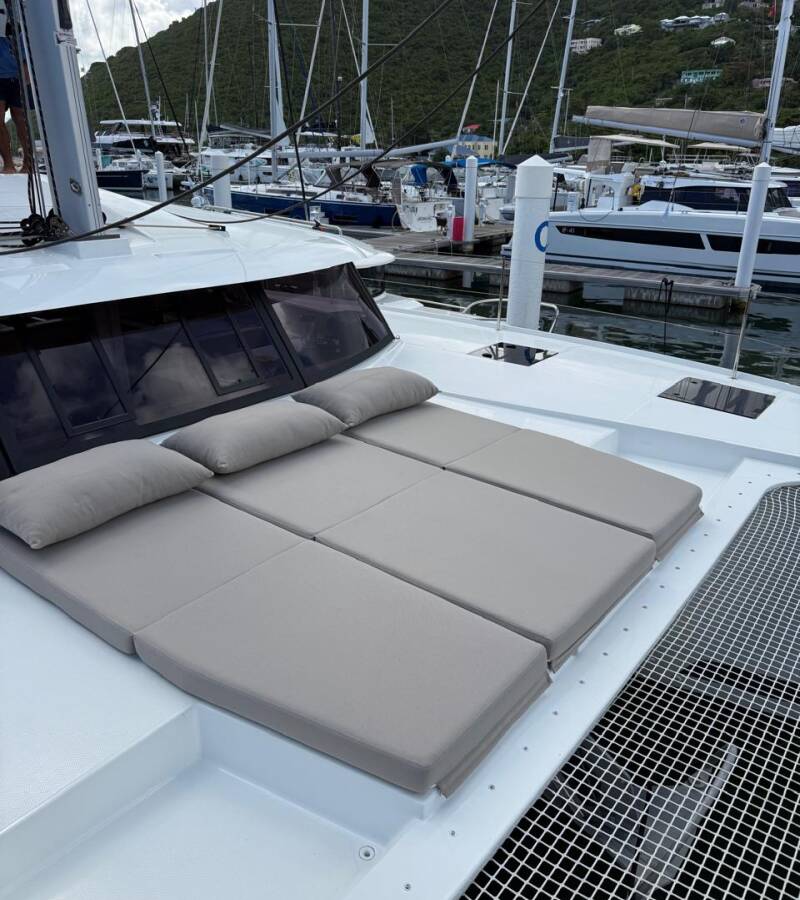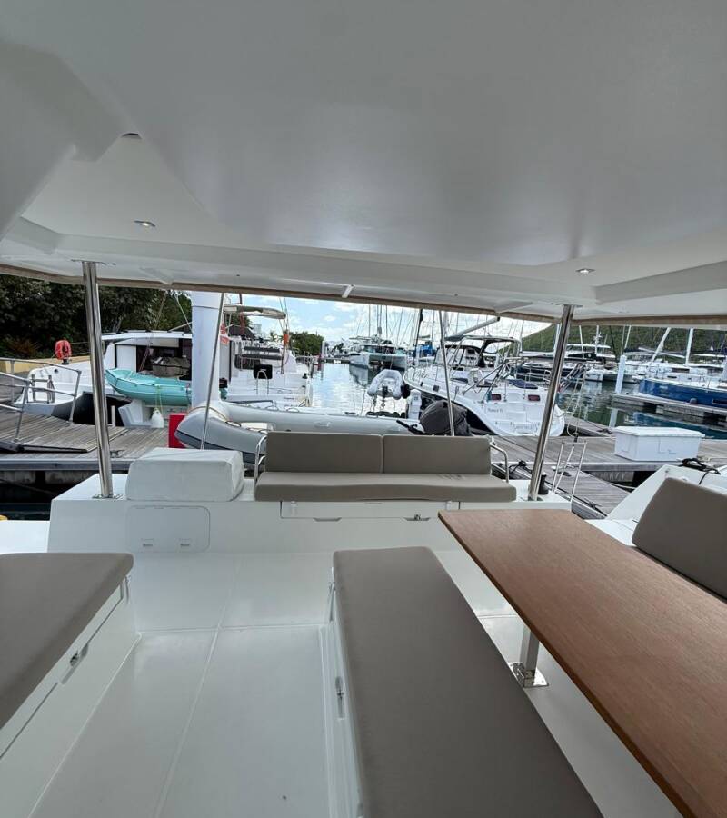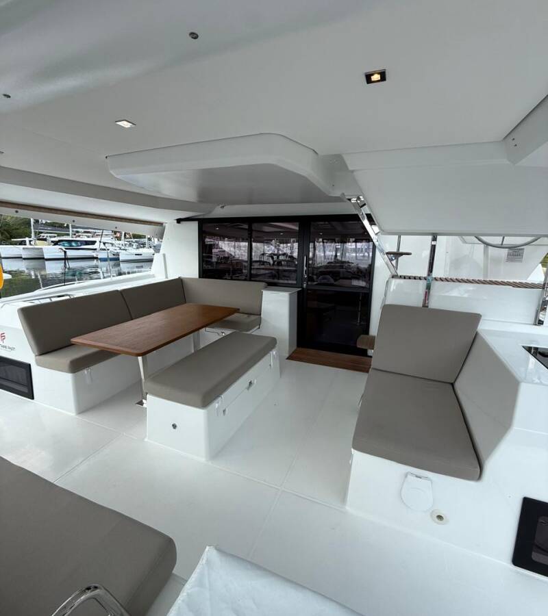 Die Fountaine Pajot Tanna 47 Maestro "Playful" ist ausgestattet mit einem Großsegel und einem Genoa sowie einer Autopilot, Teak im Cockpit.