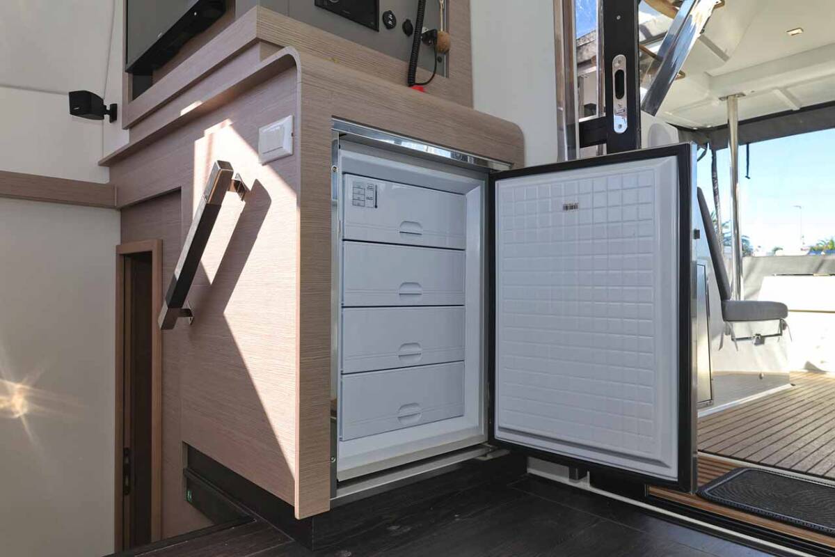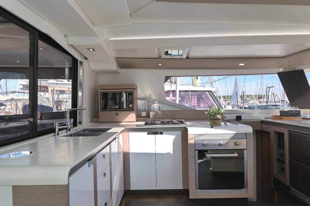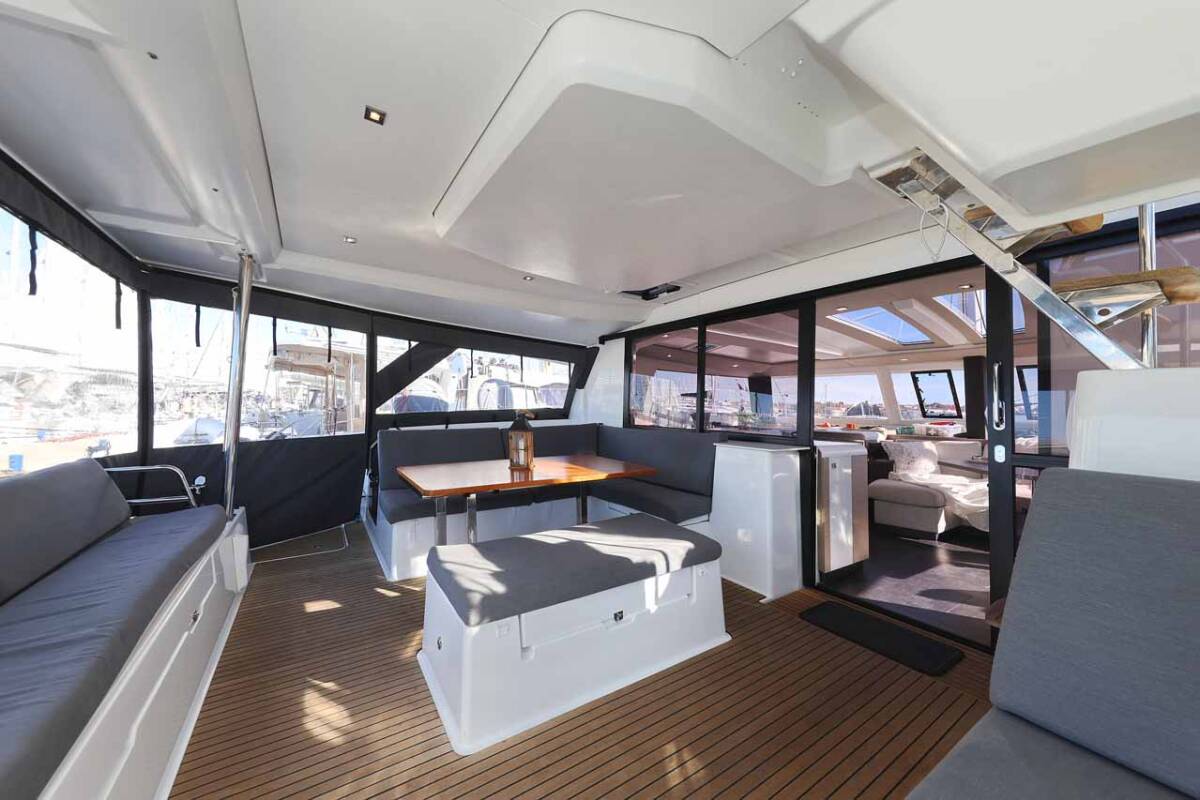 Die Fountaine Pajot Tanna 47 "Maya I" ist ausgestattet mit einem Großsegel und einem Genoa sowie einer Bimini Top, Autopilot, Sprayhood, Heizung, Teak im Cockpit, GPS Kartenplotter - Cockpit.