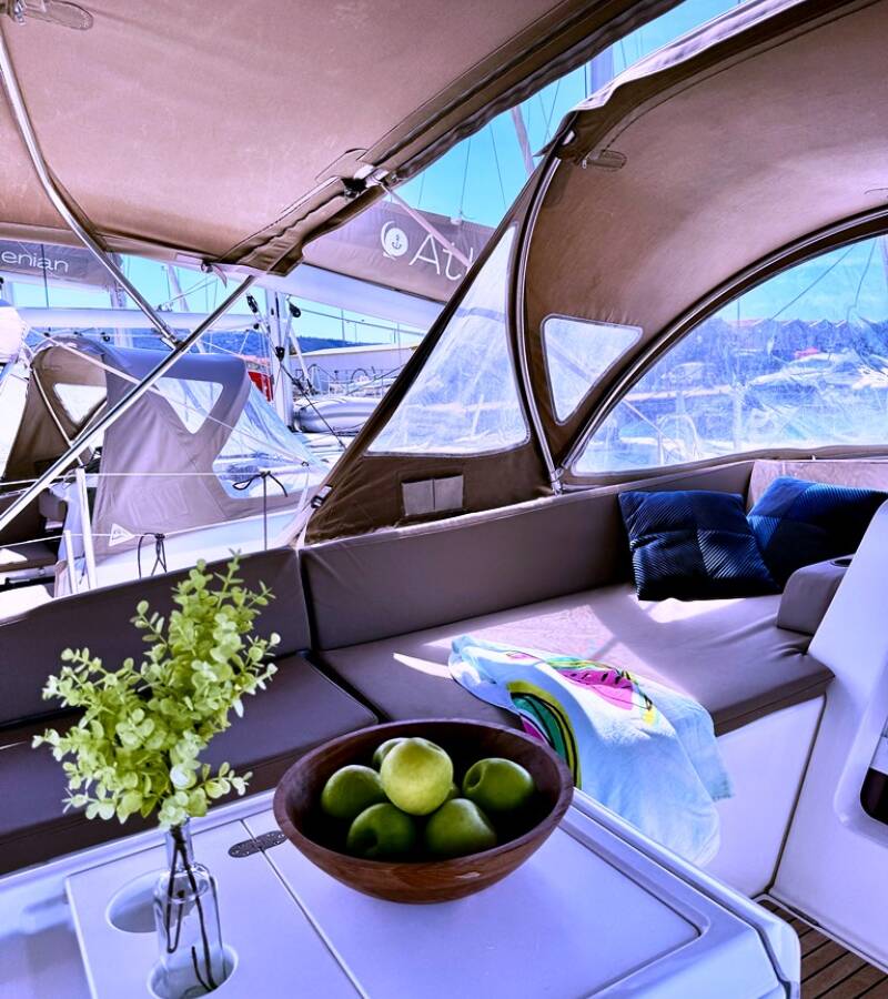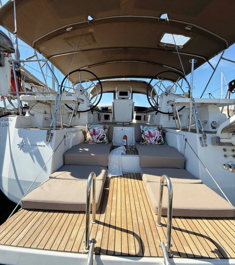 Die Jeanneau 54 "Our Lady" ist ausgestattet mit einem Großsegel und einem Genoa sowie einer Bimini Top, Autopilot, Sprayhood, Teak im Cockpit, GPS Kartenplotter - Cockpit.
