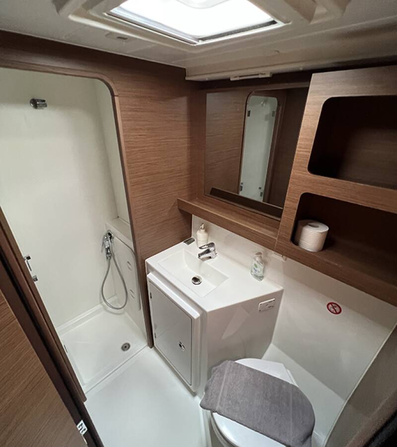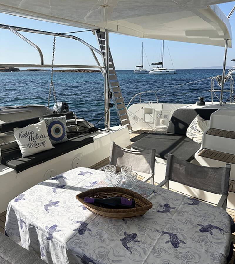 Die Lagoon 42 "Aktis" ist ausgestattet mit einem Großsegel und einem Genoa sowie einer Teak im Cockpit.