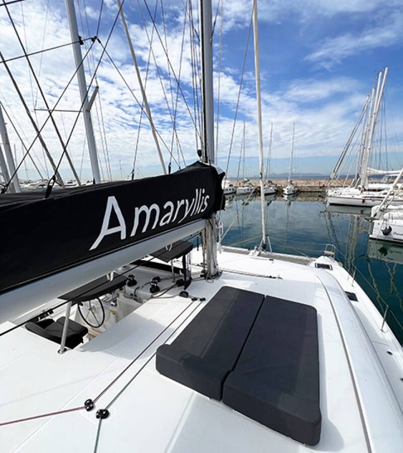 Die Lagoon 42 "Amaryllis" ist ausgestattet mit einem Großsegel und einem Genoa sowie einer Autopilot, Teak im Cockpit.