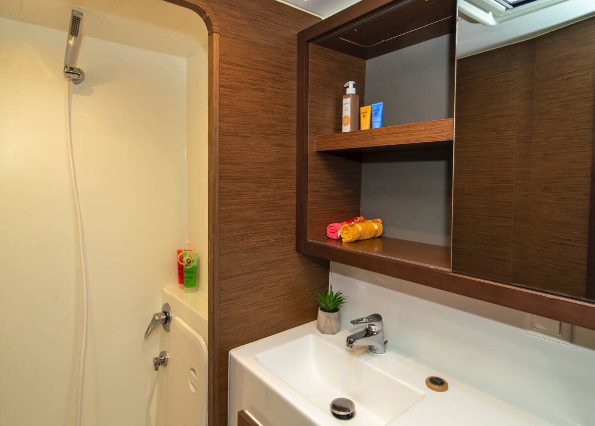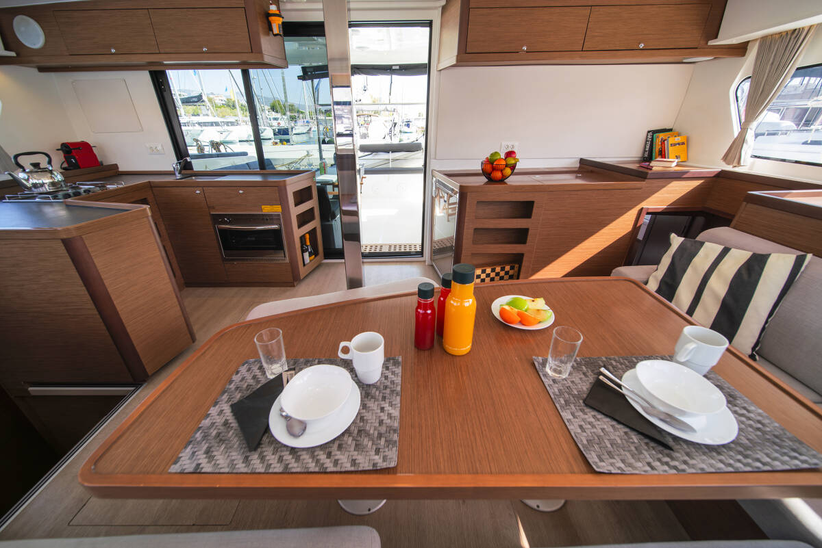 Die Lagoon 42 "Karteria" bietet besonderen Komfort mit folgenden Ausstattungsmerkmalen: Generator, Klimaanlage, Cockpit Kissen, Elektrische Toilette, Solar Panel.