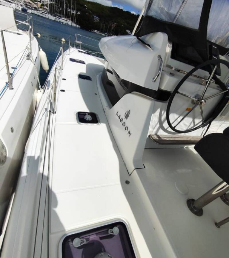 Die Lagoon 42 "VIOLET" ist ausgestattet mit einem Großsegel und einem Genoa sowie einer Bimini Top, Autopilot.