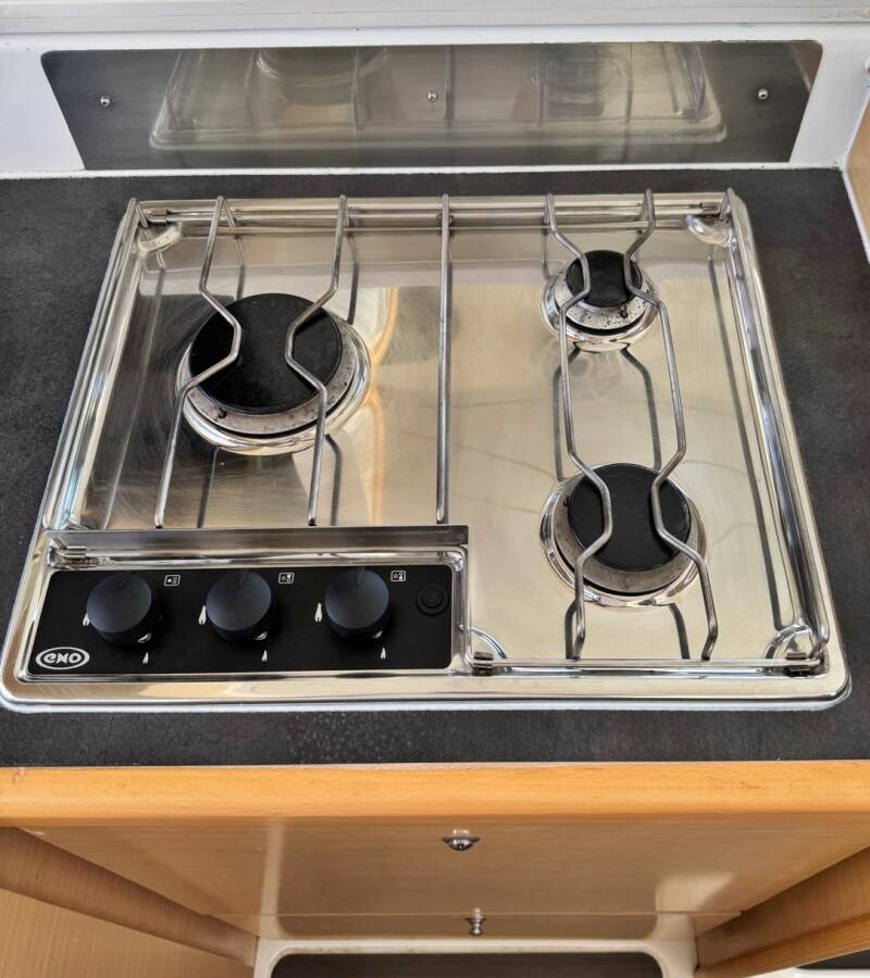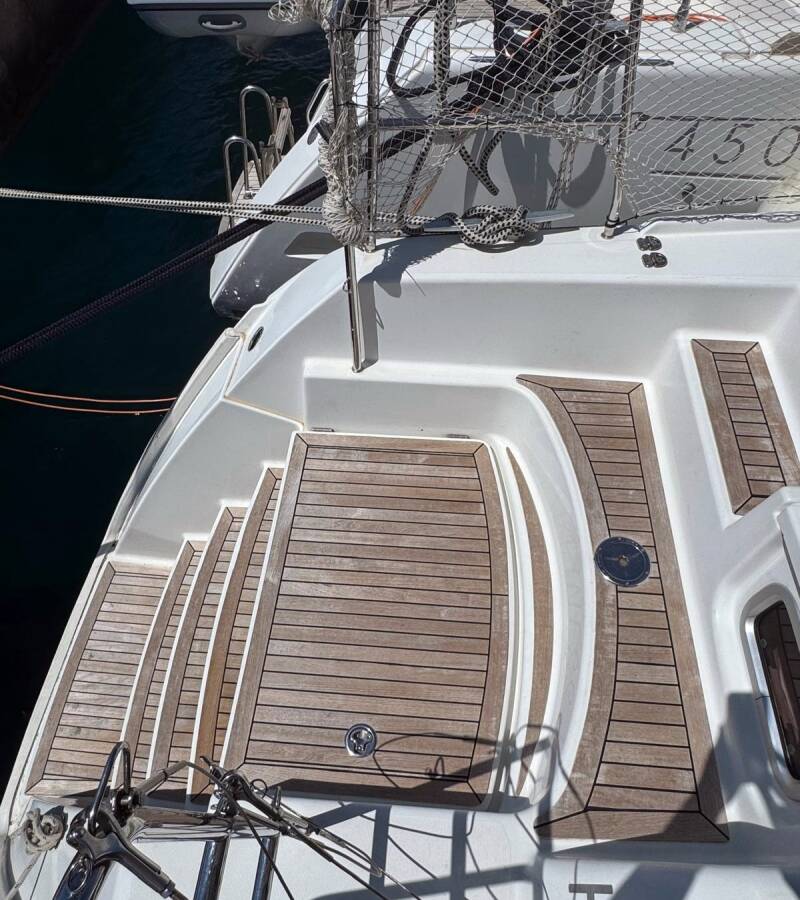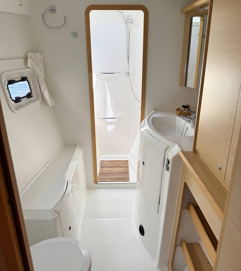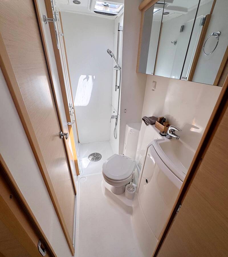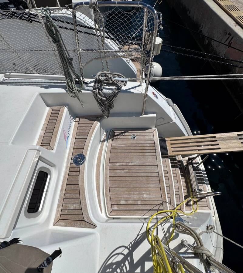 Die Lagoon 421 "Happiness" ist ausgestattet mit einem Großsegel und einem Genoa sowie einer Radar, Bimini Top, Autopilot, Heizung, Teak im Cockpit.
