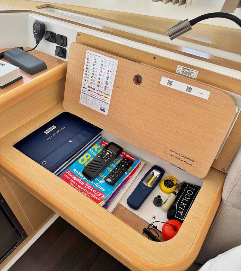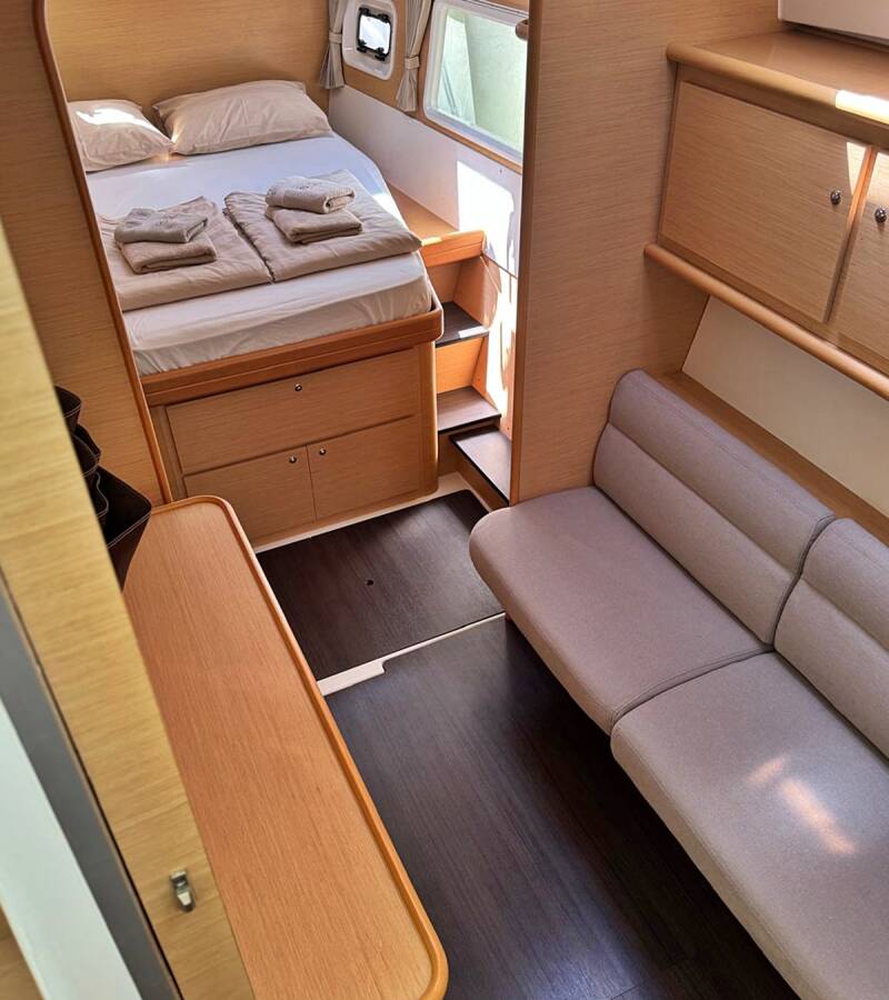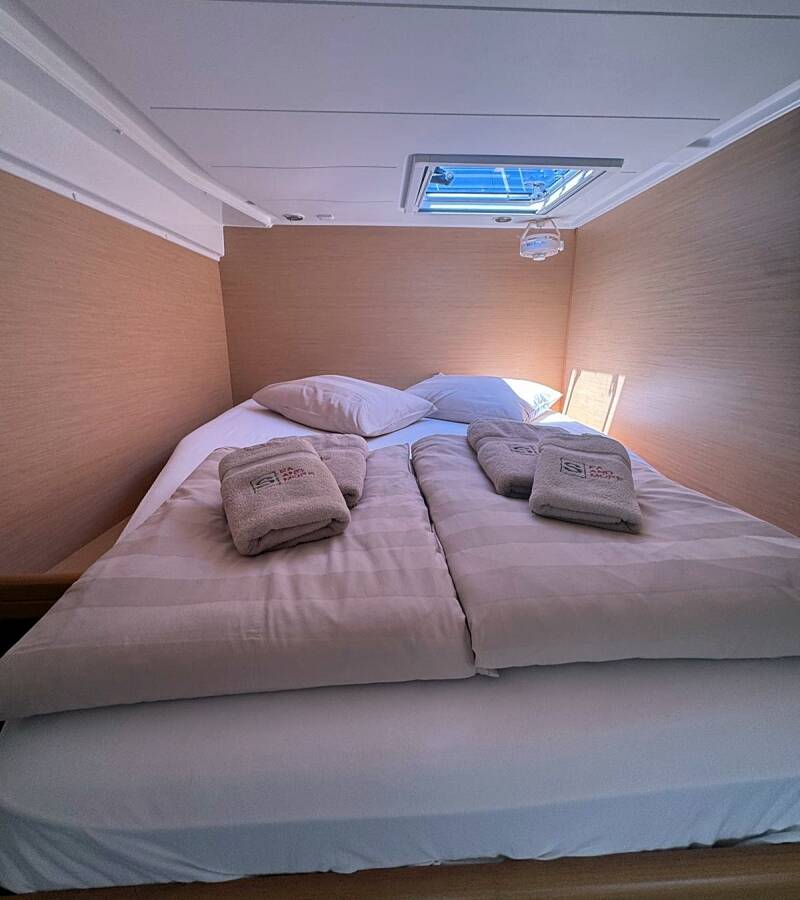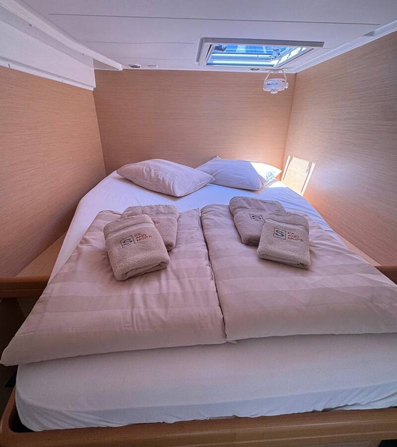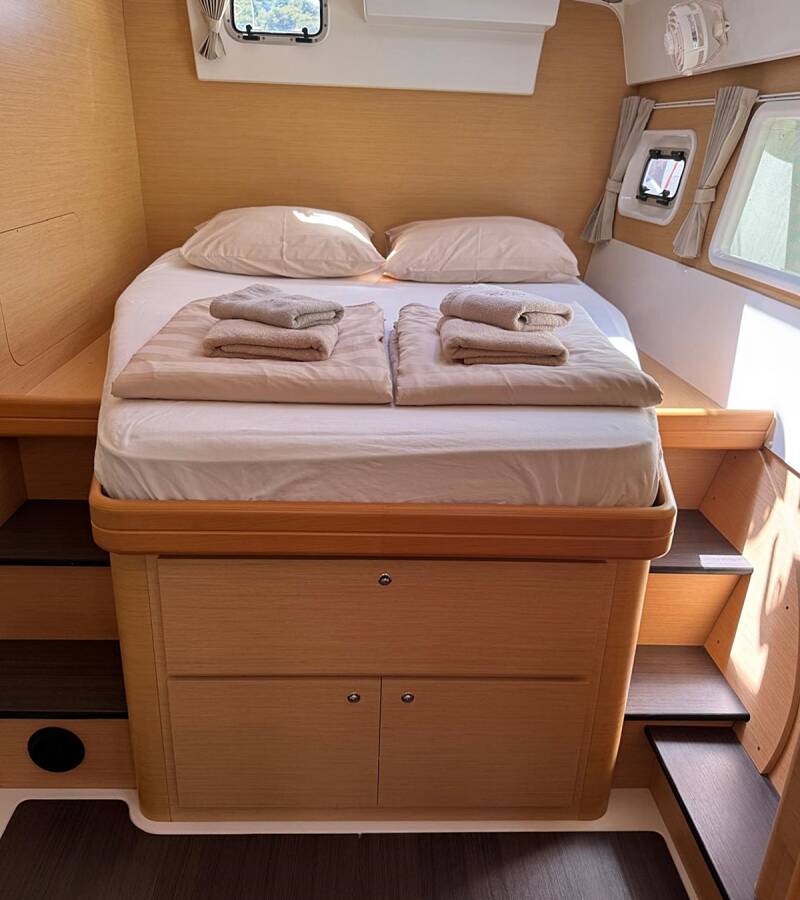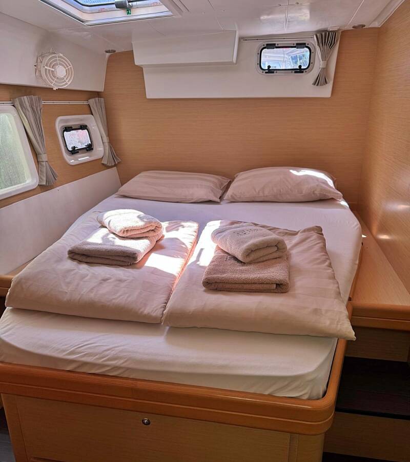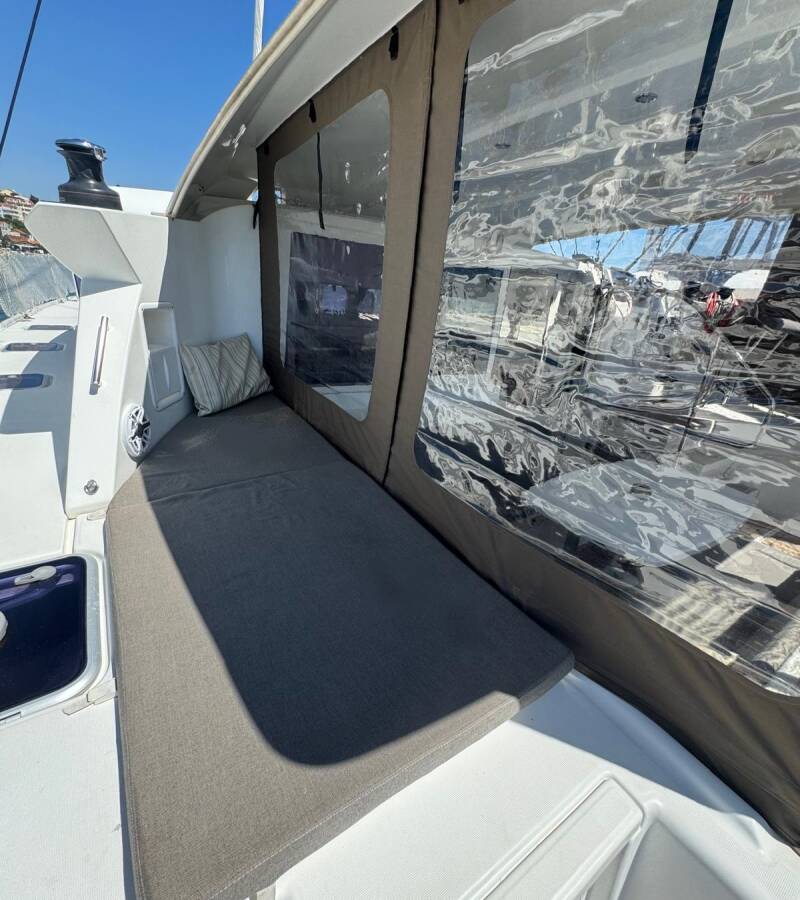Die Lagoon 421 "Happiness" bietet besonderen Komfort mit folgenden Ausstattungsmerkmalen: Generator, Klimaanlage, Cockpit Kissen, Inverter, Solar Panel.