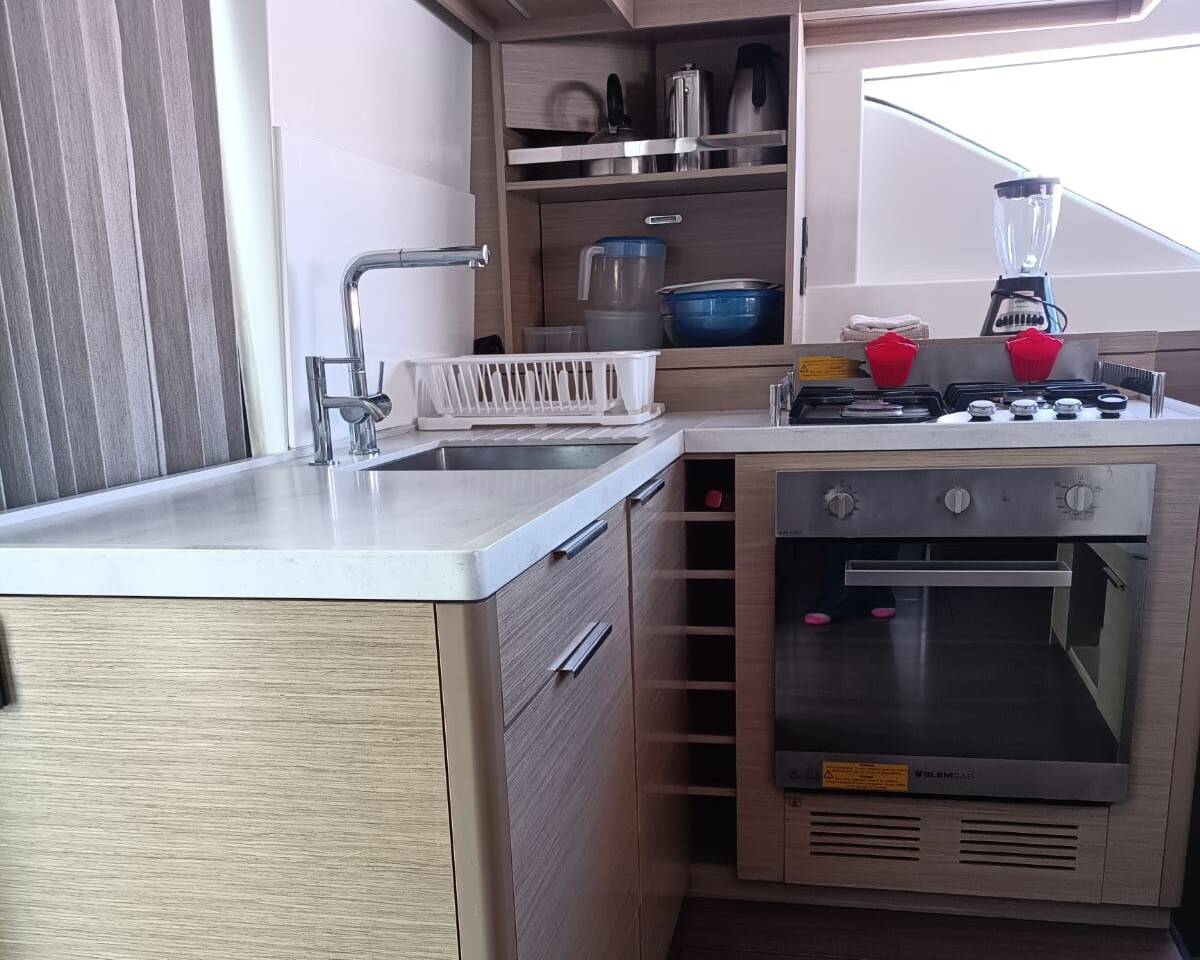Die Lagoon 51 "SEA BEAR" bietet besonderen Komfort mit folgenden Ausstattungsmerkmalen: Generator, Klimaanlage, Tiefkühlfach, Cockpit Kissen, Inverter, Elektrische Toilette.