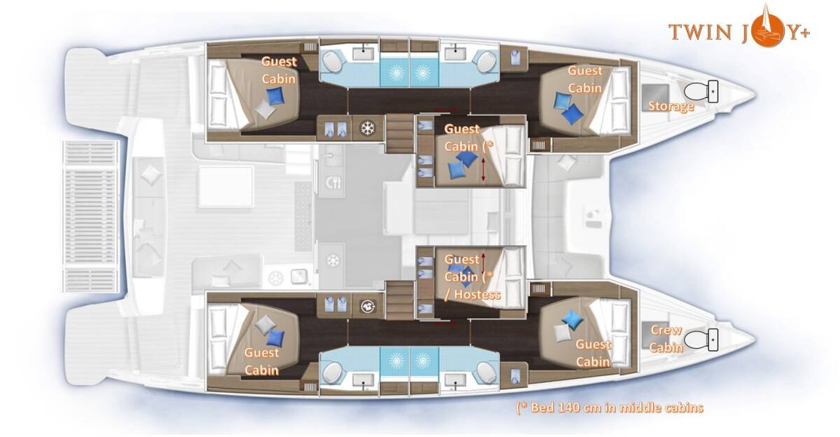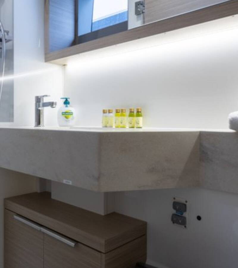 Die Lagoon 51 "Twin Joy +" bietet besonderen Komfort mit folgenden Ausstattungsmerkmalen: Bugstrahlruder, Generator, Klimaanlage, Tiefkühlfach, Waschmaschine, Badeplattform, Elektrische Toilette, Spülmaschine.