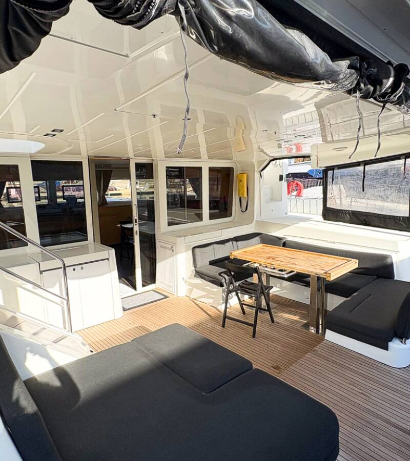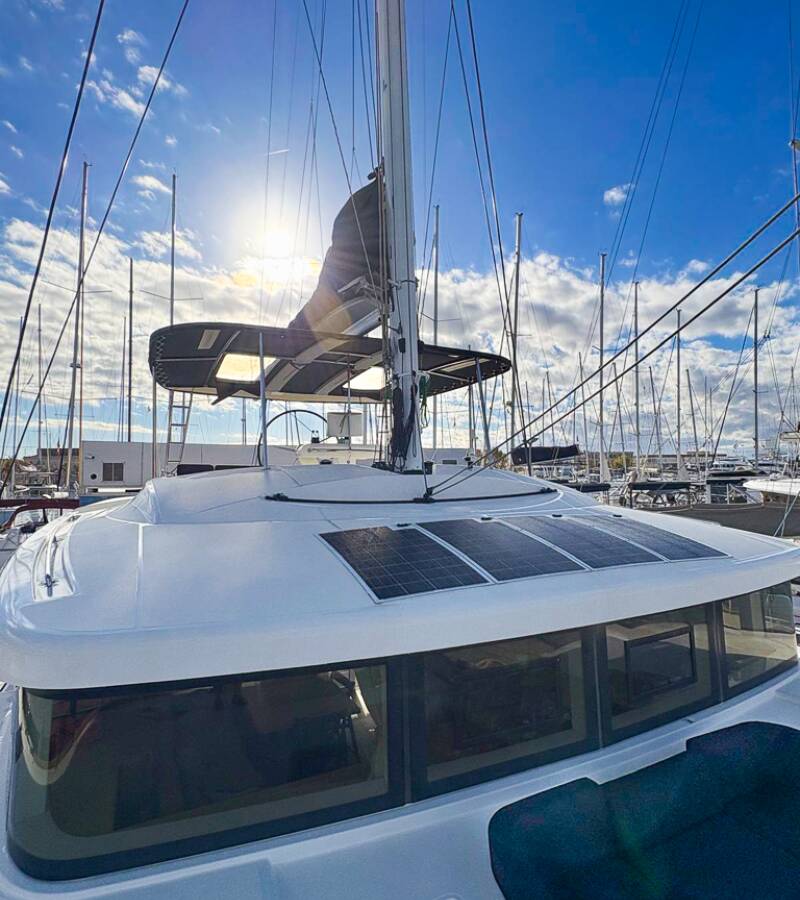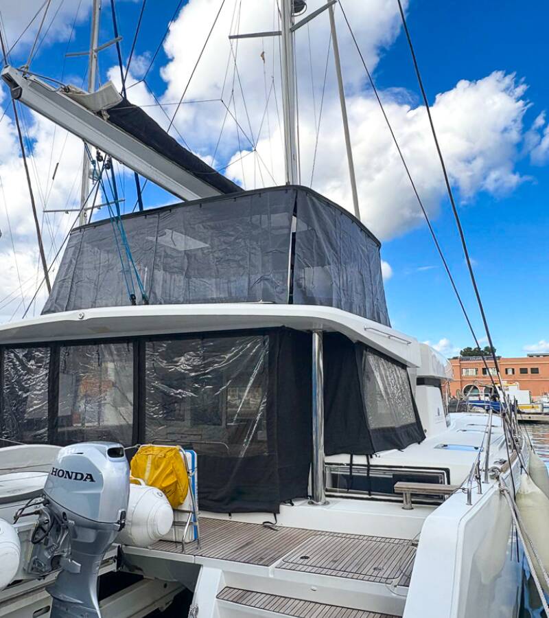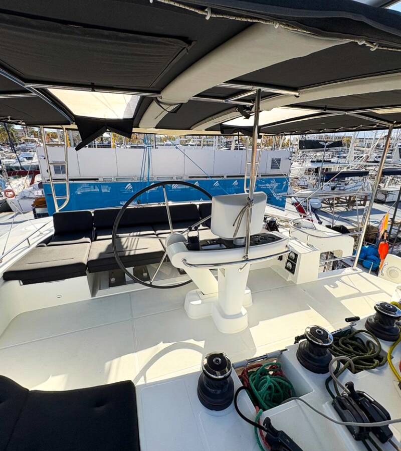 Die Lagoon 52 F "La Dolce Vita" ist ausgestattet mit einem Großsegel und einem Genoa sowie einer Radar, Bimini Top, Autopilot, Heizung, Teak im Cockpit.