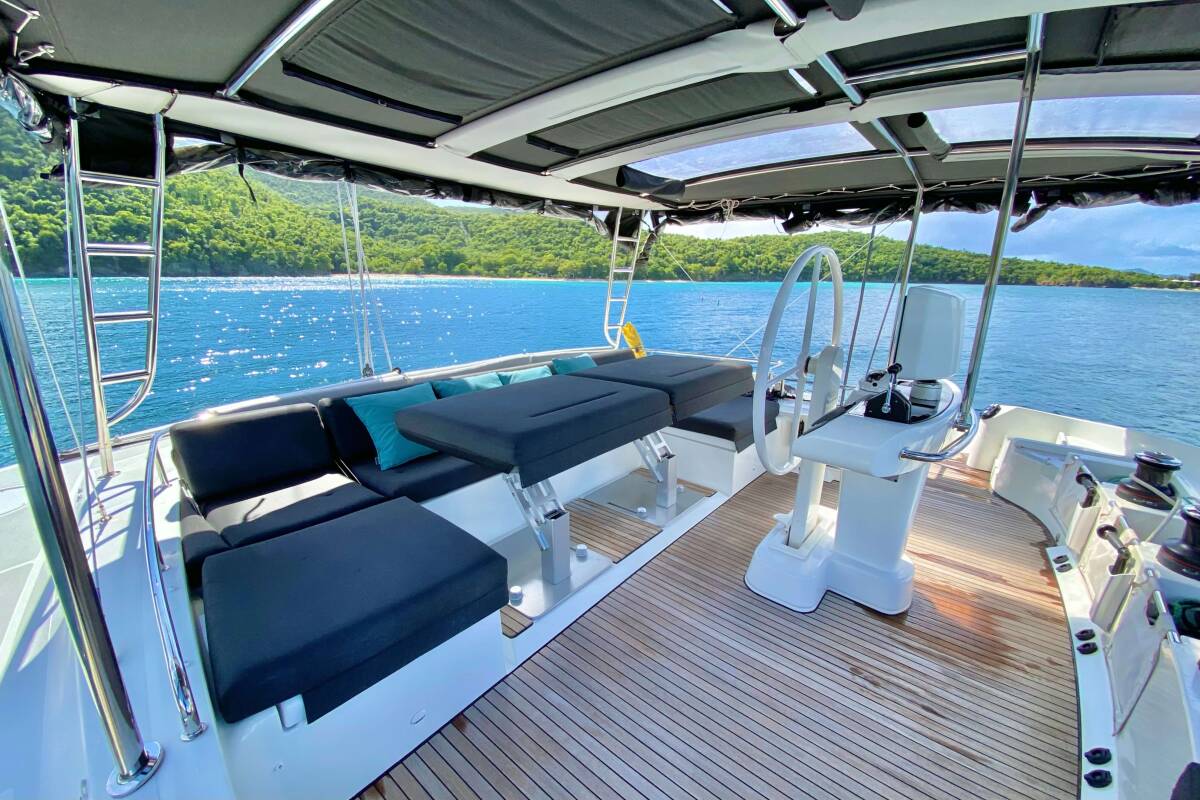Die Lagoon 52 "Ventana Al Mar" ist ausgestattet mit einem Großsegel und einem Genoa sowie einer Bimini Top, Teak im Cockpit.