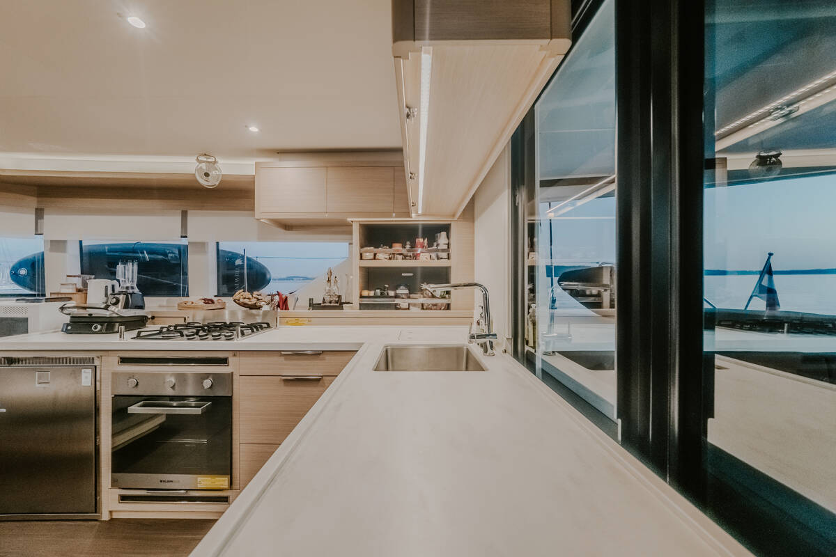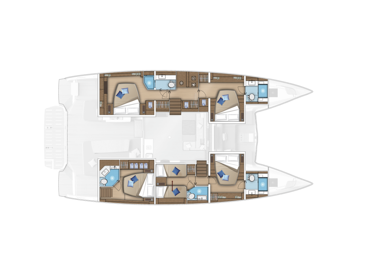 Die Lagoon 55 "Triwing Ossus" bietet besonderen Komfort mit folgenden Ausstattungsmerkmalen: Bugstrahlruder, Generator, Klimaanlage, Tiefkühlfach, Inverter, Elektrische Toilette, Spülmaschine.