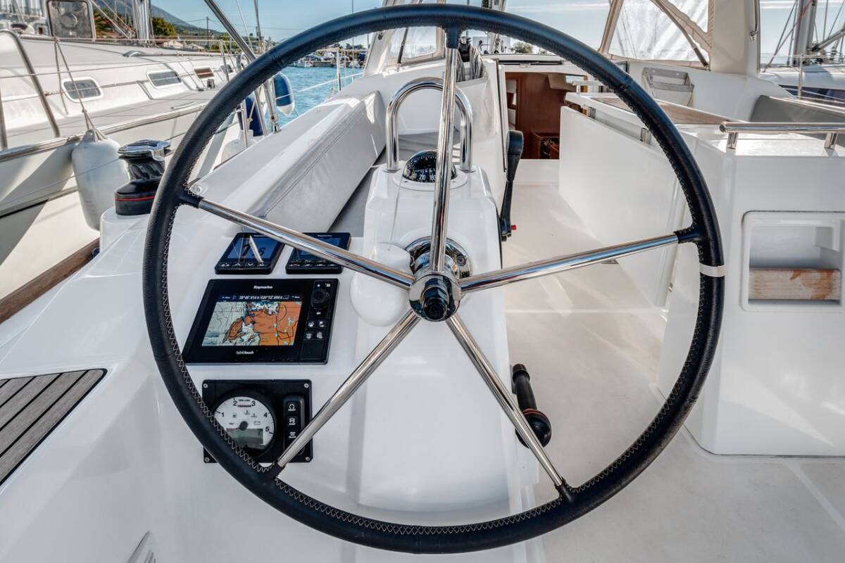 Die Oceanis 38.1 "Harmonia" ist ausgestattet mit einem Großsegel und einem Genoa sowie einer Bimini Top, Autopilot, Sprayhood, GPS Kartenplotter - Cockpit.