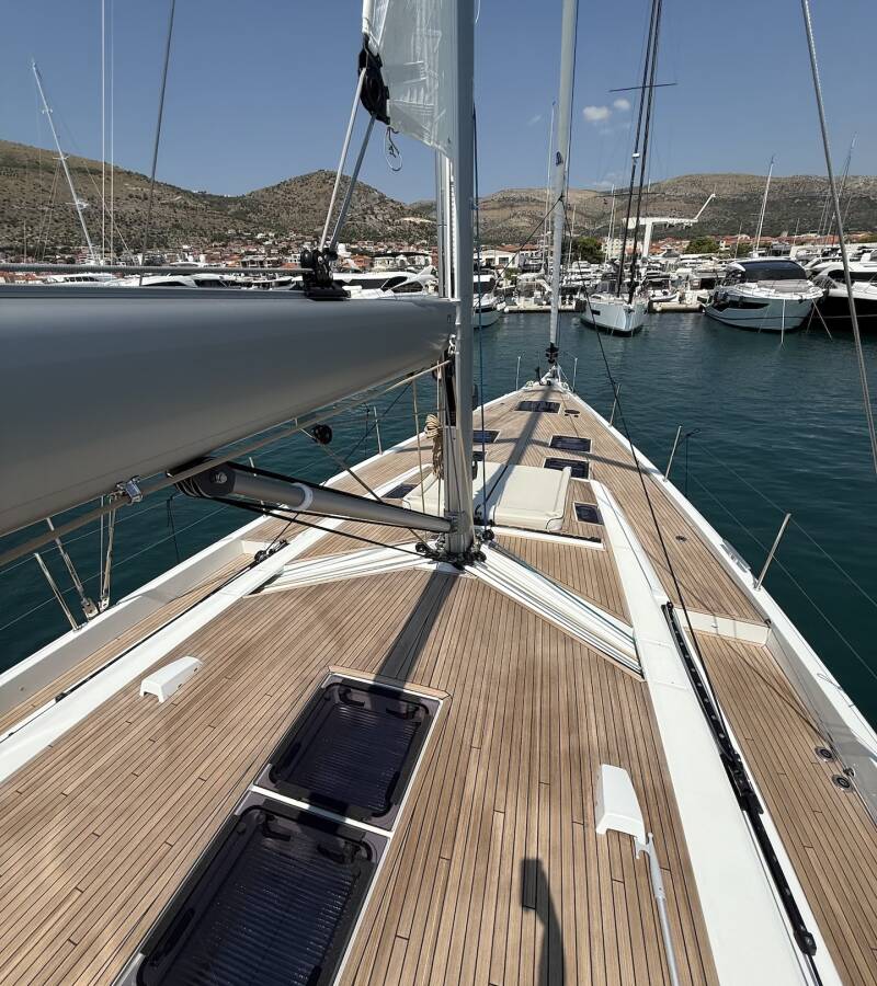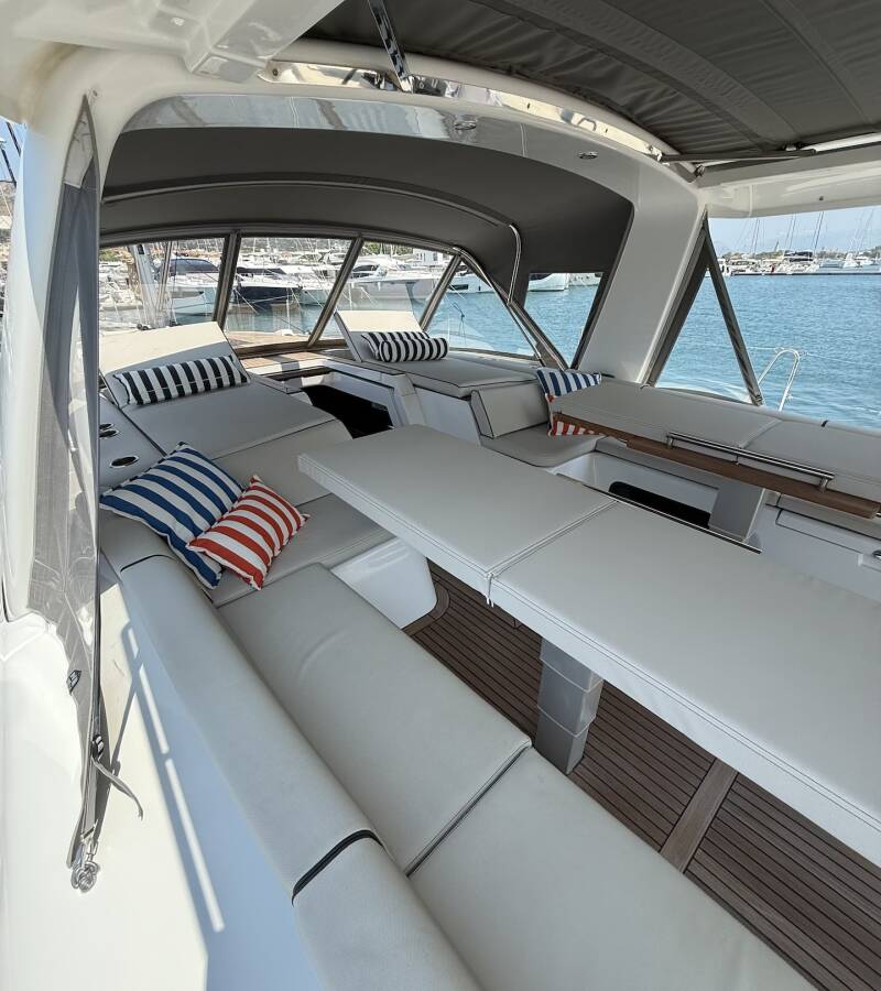 Die Oceanis 60 "Scorpio III" ist ausgestattet mit einem Großsegel und einem Genoa sowie einer Autopilot, Teak im Cockpit.