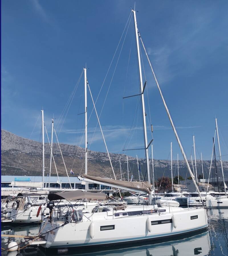 Die Sun Odyssey 440 "Habibi" ist ausgestattet mit einem Großsegel und einem Genoa sowie einer Bimini Top, Autopilot, Sprayhood, Heizung.