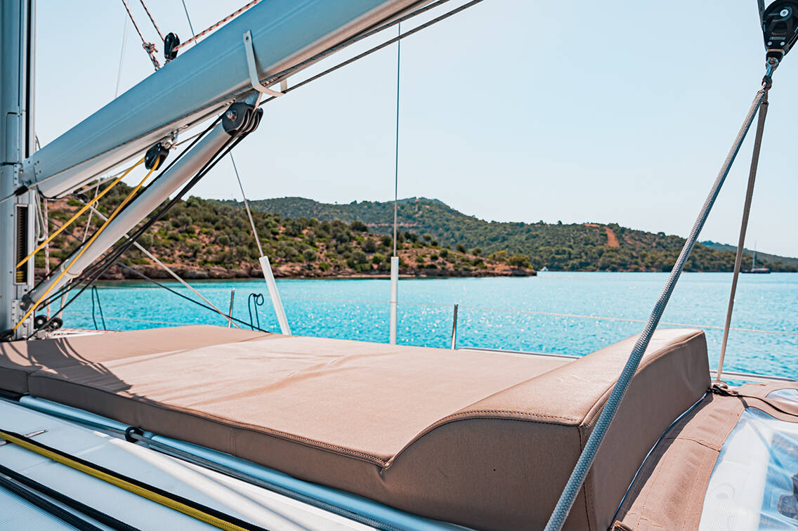 Die Sun Odyssey 490 "Notus" ist ausgestattet mit einem Großsegel und einem Genoa sowie einer Bimini Top, Autopilot, Sprayhood, Teak im Cockpit.