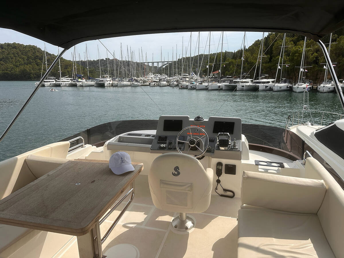 Die Swift Trawler 41 Fly "Moritz" ist ausgestattet mit einer Bimini Top, Autopilot, Heizung, GPS Kartenplotter - Cockpit.