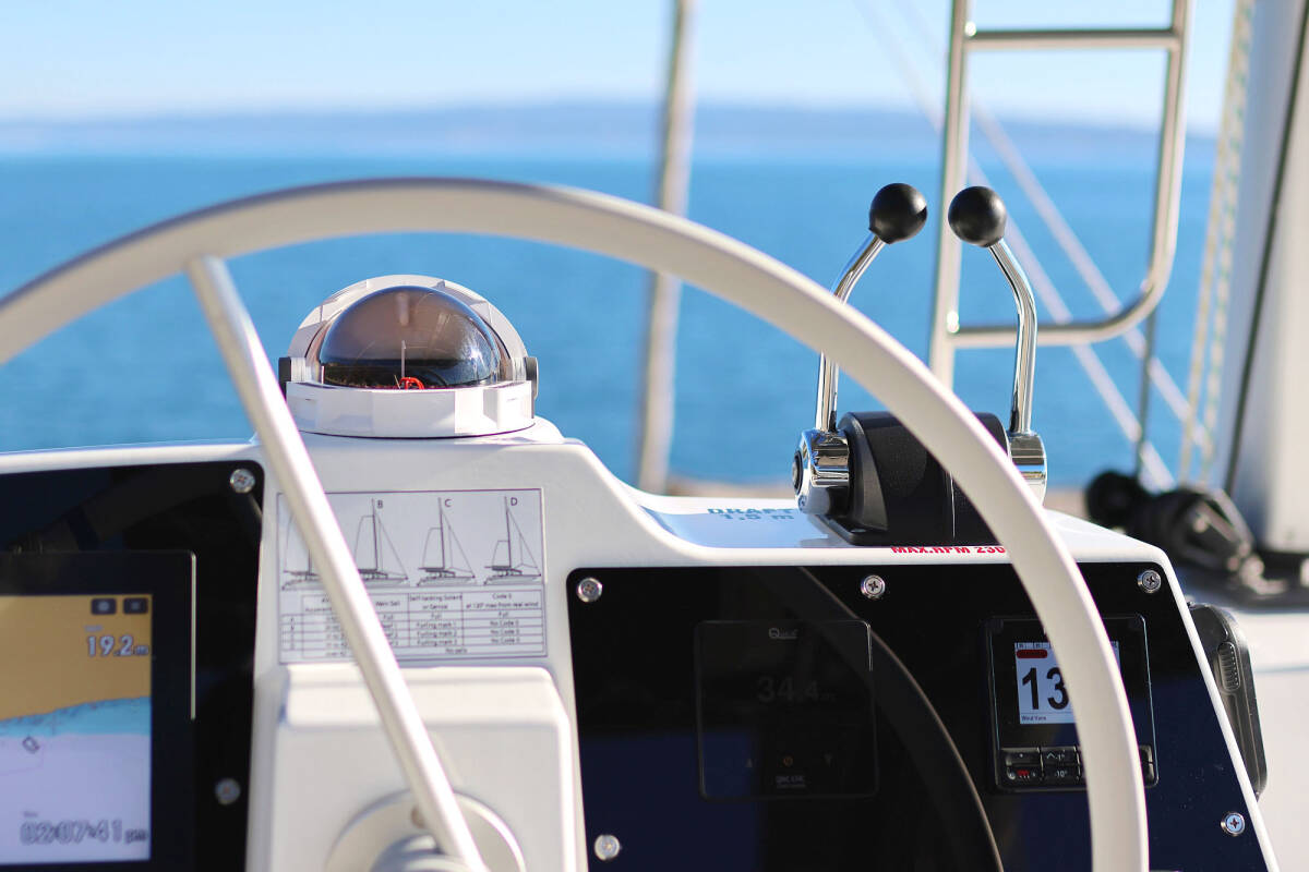 The Bali 4.6 „Belle Amie“ is equipped with a mainsail and a genoa as well as a Bimini top, Autopilot, Heating, Teak cockpit, GPS chart plotter - cockpit.