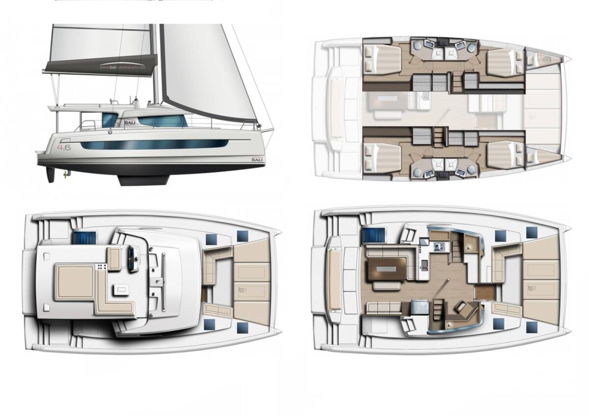 The Bali 4.6 „Ediba Senior“ offers special comfort with the following equipment features: Generator, Air Conditioning, Freezer, Cockpit cushions, Bathing platform, Inverter, Dishwasher.