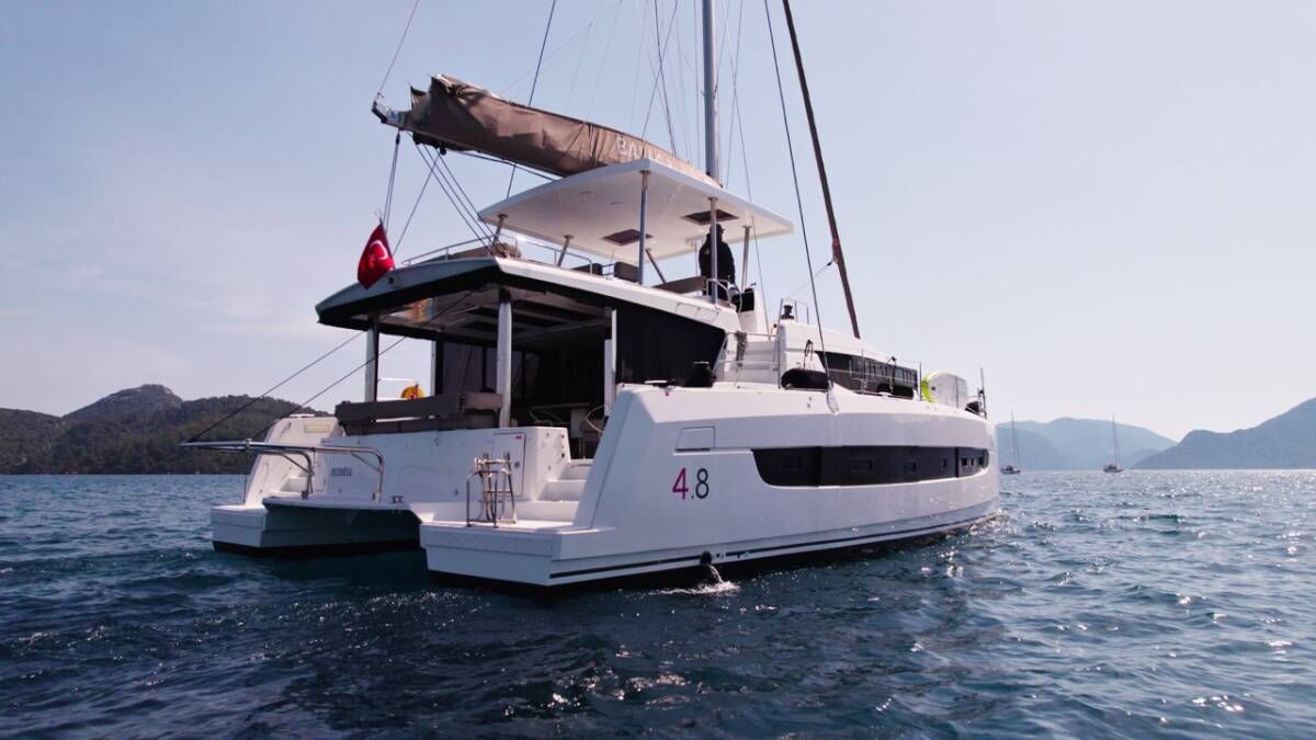 The Bali 4.8 „Pagora“ is equipped with a mainsail and a genoa as well as a Bimini top, Autopilot.