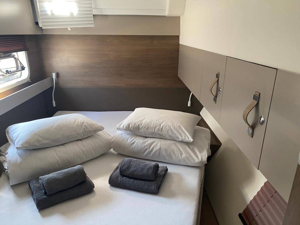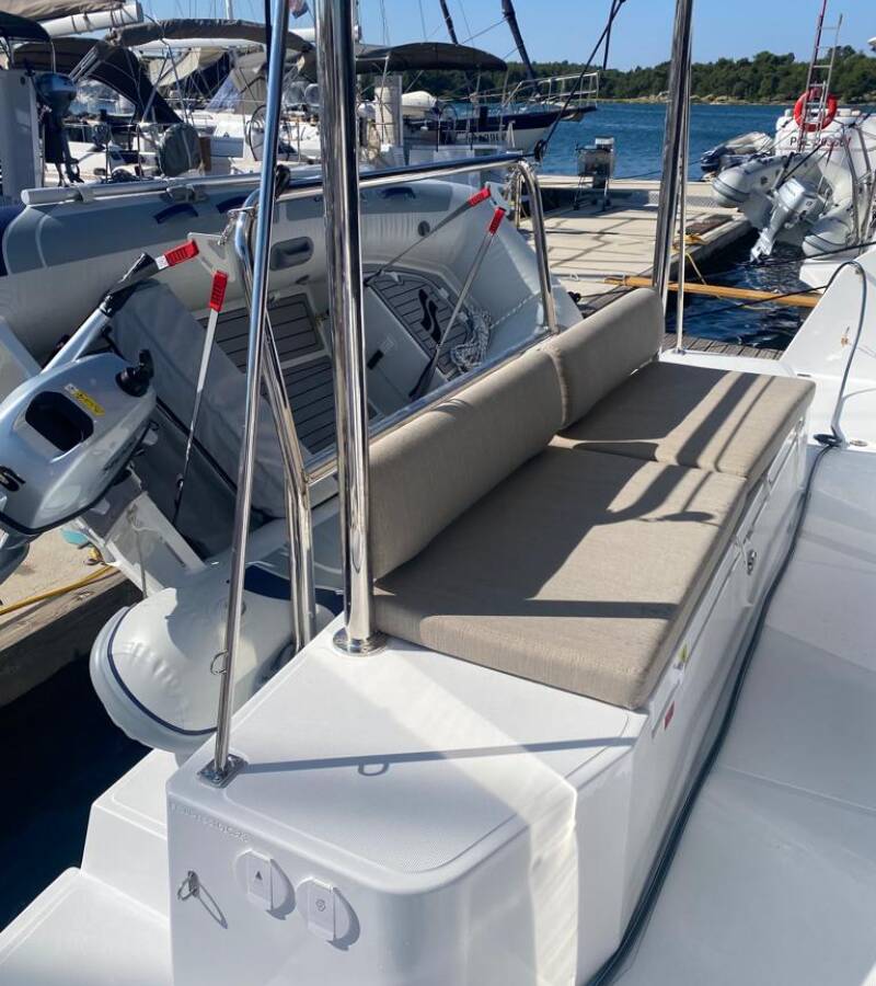 The Bali Catspace „Free Flow“ is equipped with a mainsail and a genoa as well as a Bimini top, Sprayhood, GPS chart plotter - cockpit.