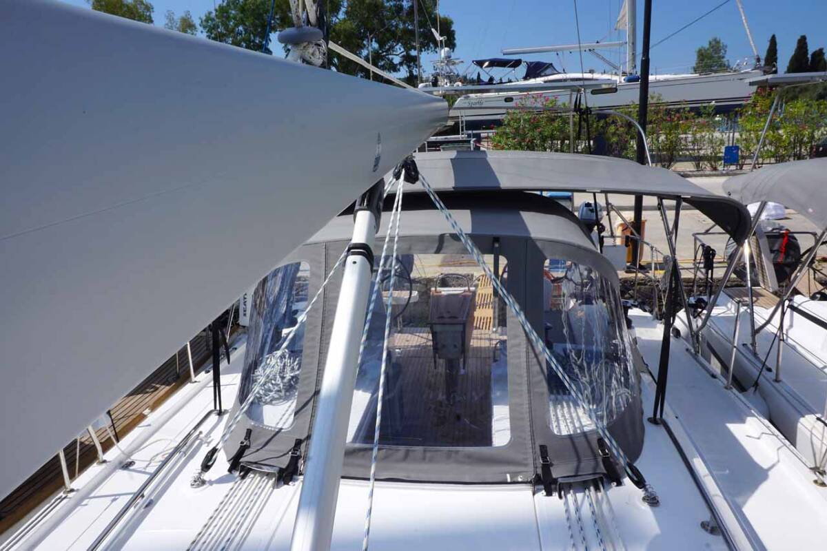 The Bavaria C38 „Elaia“ is equipped with a mainsail and a genoa as well as a Bimini top, Autopilot, Sprayhood, Teak cockpit, GPS chart plotter - cockpit.