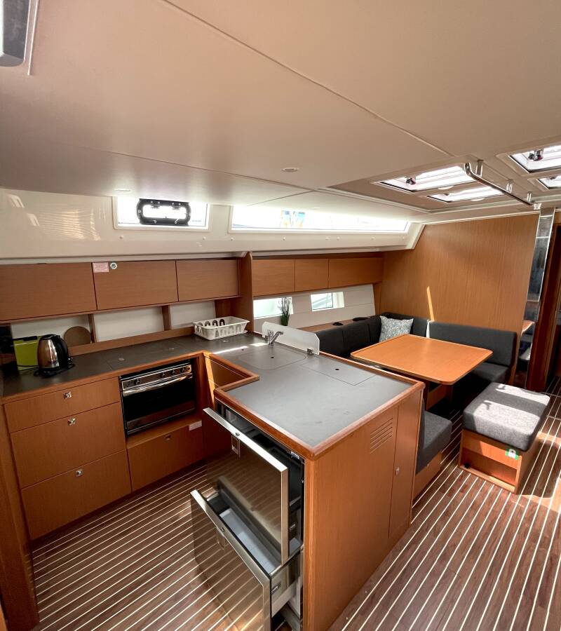 The Bavaria C50 Holiday „Hangover“ offers special comfort with the following equipment features: Bow thruster, Generator, Air Conditioning, Freezer, Cockpit cushions, Bathing platform, Inverter, Cockpit grill.