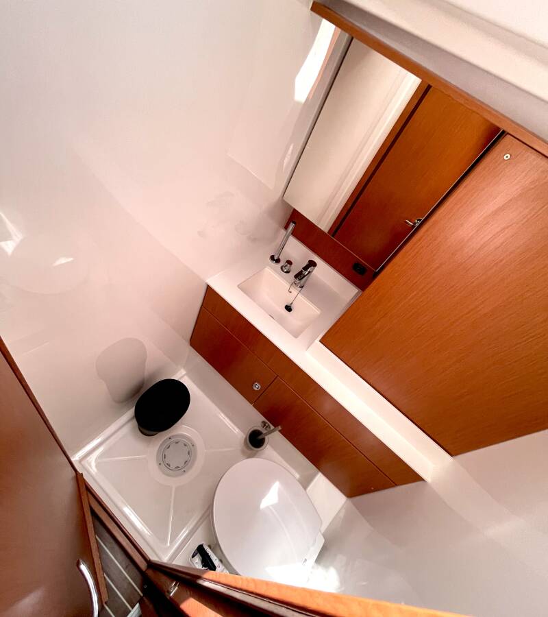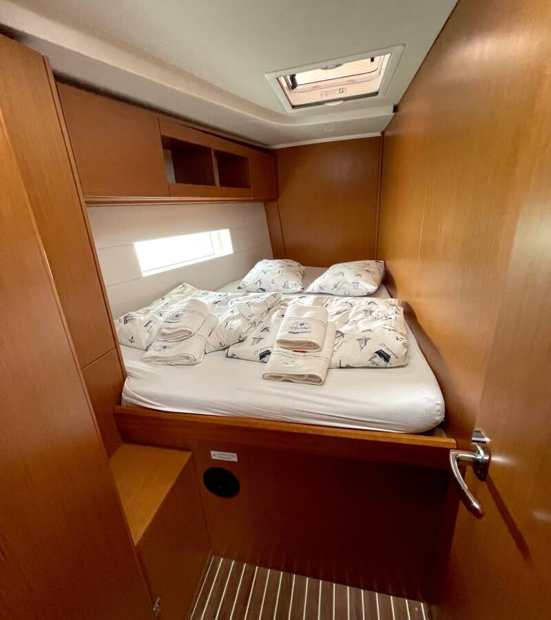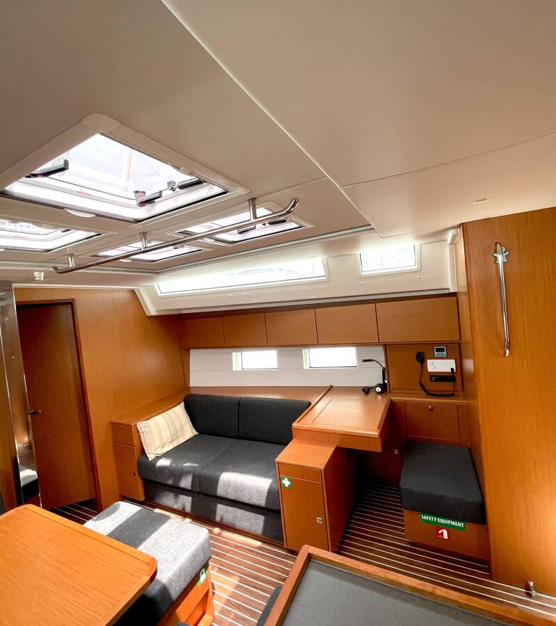 The Bavaria C50 Holiday „Hangover“ is equipped with a mainsail and a genoa as well as a Bimini top, Autopilot, Sprayhood, Teak cockpit.
