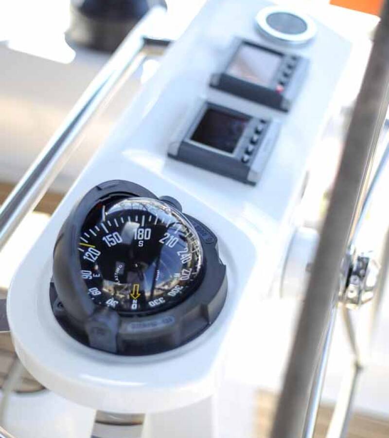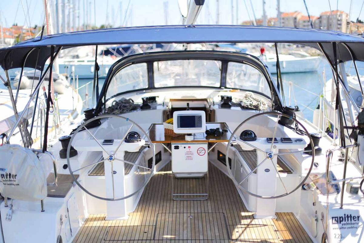 The Bavaria Cruiser 45 „Wolke 7“ is equipped with a mainsail and a genoa as well as a Bimini top, Autopilot, Sprayhood, Heating, Teak cockpit, GPS chart plotter - cockpit.