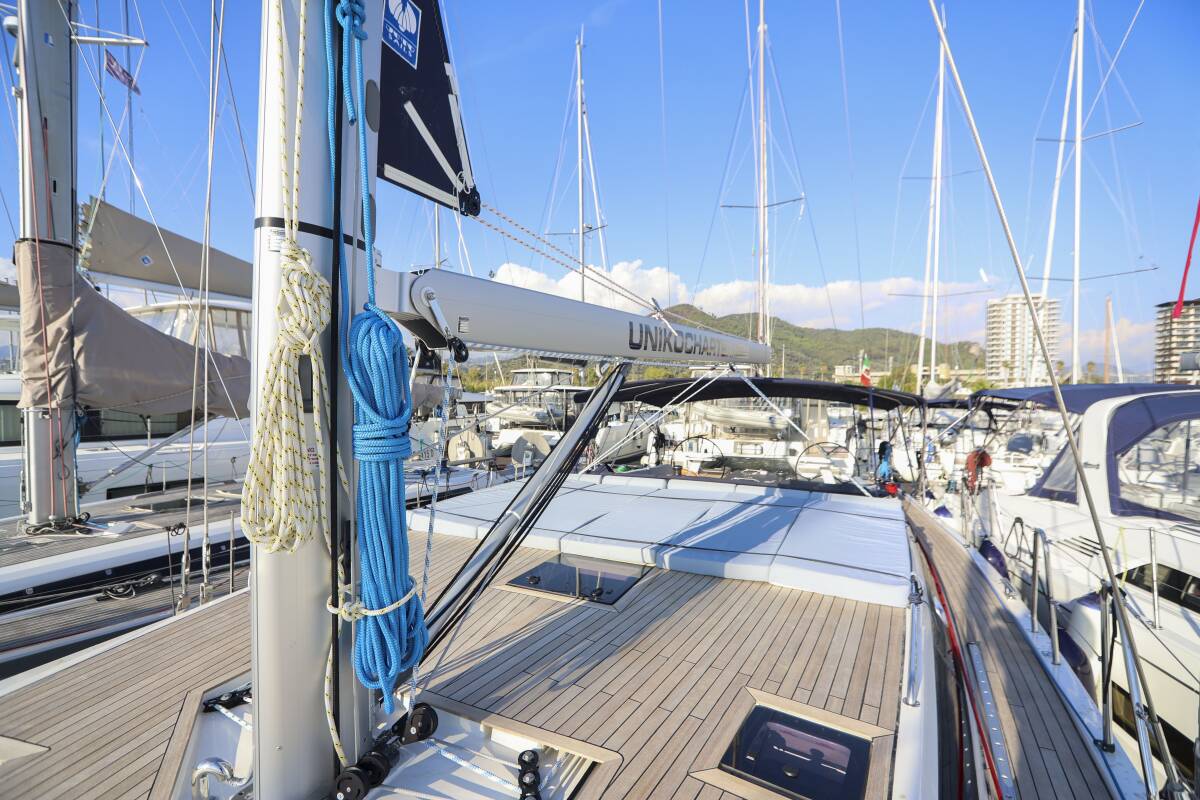 The D&D Kufner 50 „Luna Blu“ is equipped with a mainsail and a genoa as well as a Bimini top, Autopilot, Sprayhood, Teak cockpit, GPS chart plotter - cockpit.